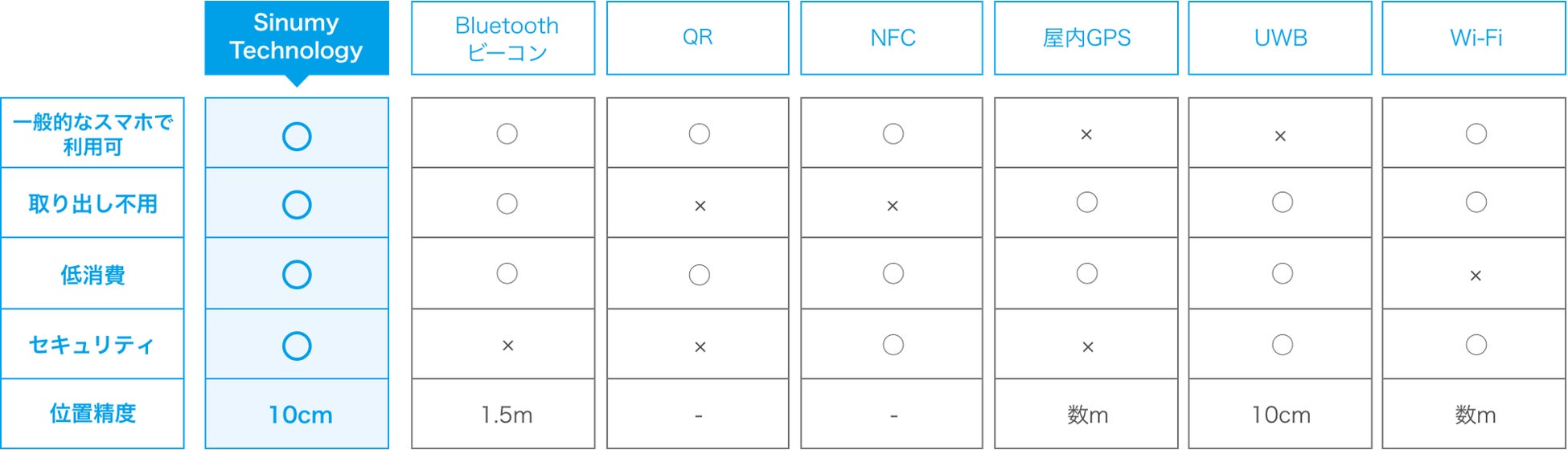 当社は、この技術を「Sinumy Technology」と呼んでいます。Sinumy Technologyは、セキュアな個人認証技術と高速高精度な位置測定技術により、スリープ状態のスマートフォンでのハンズフリー認証や非接触認証を可能にする技術です。