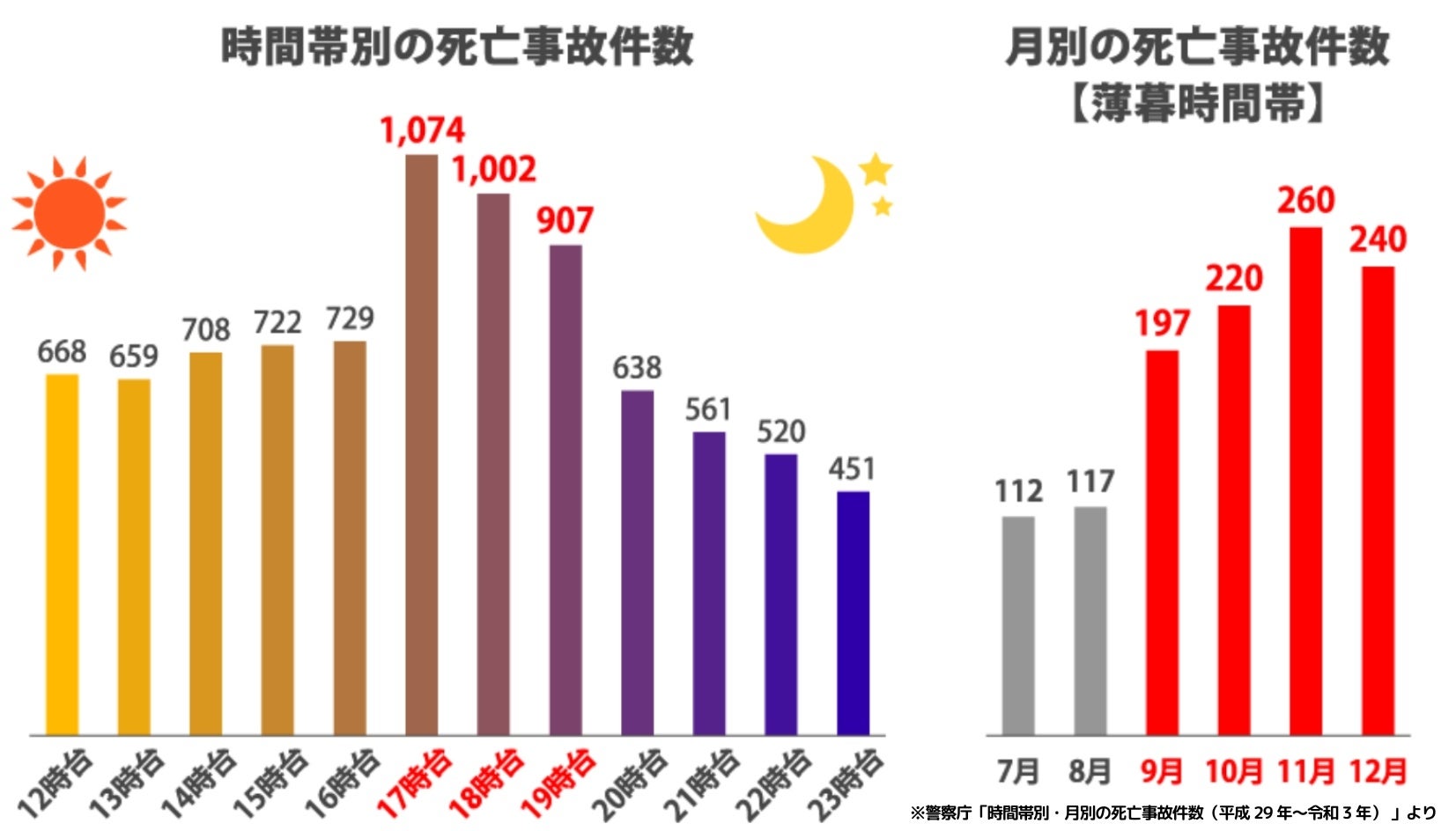 交通死亡事故は、1日の中で 17 時台~19時台に最も多く発生します。そして、日没時間が急激に早まる9月以降に、その数は一気に増える傾向があります。