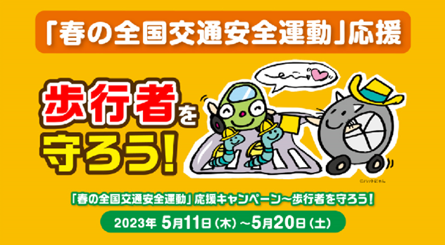 2023年の内閣府推進「春の全国交通安全運動」の重点項目のひとつである「こどもを始めとする歩行者の安全の確保」に協力するため、「歩行者を守ろう!」キャンペーンを実施しました。