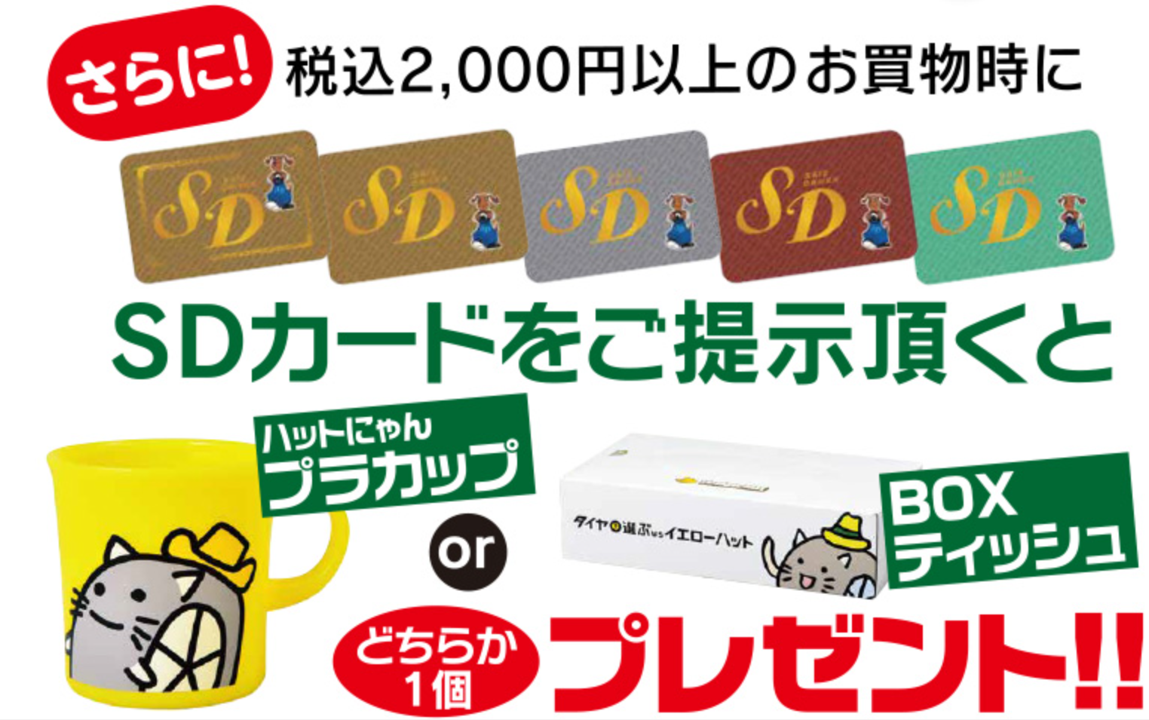 キャンペーン期間中、店頭で税込2,000円以上のお買物に「SDカード(Safe Driverカード)」をご提示いただいた方には「ハットにゃんプラカップ」または「BOXティッシュ」をプレゼントいたします。