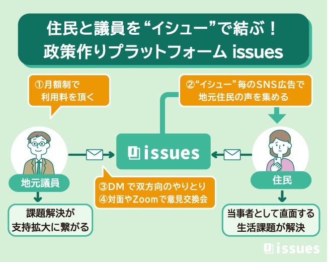 当社は「政策作りのDXにより様々な社会課題を解決するインフラを作る」をミッションに掲げ「住民と議員を “イシュー” で結ぶ!政策作りプラットフォームissues」を提供しています。①議員の方々から月額利用料を頂き、②議員の取り組むイシュー毎のSNS広告で地元住民の声を集め、③住民と議員がDMでやりとりし、④対面やZoomで意見交換会を開催。これにより住民が当事者として直面する生活課題の解決、課題解決を通した議員等の支持拡大を実現しています。