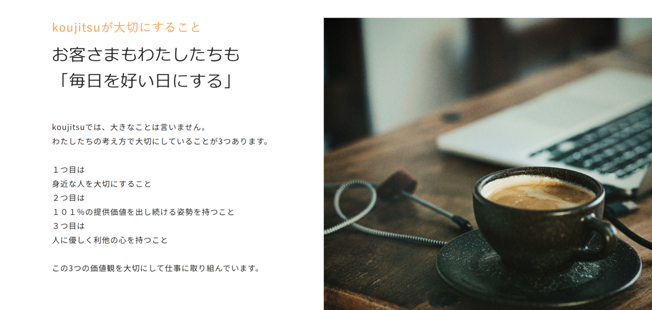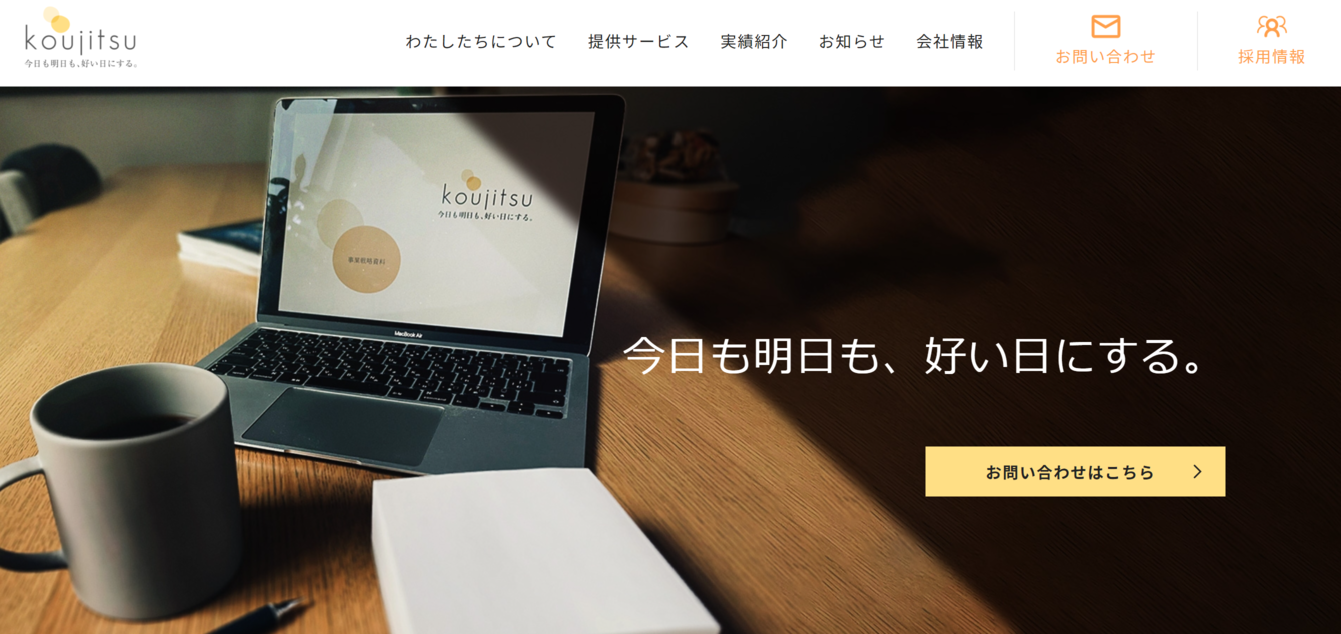 毎日が良い日となるよう努めるべきであり、日々について良し悪しを考え一喜一憂することなく常に『今この時が大切』と思えるように。あるがままを良しとして受け入れることを大事にする、という意味を込めて、「koujitsu」という社名にしました。