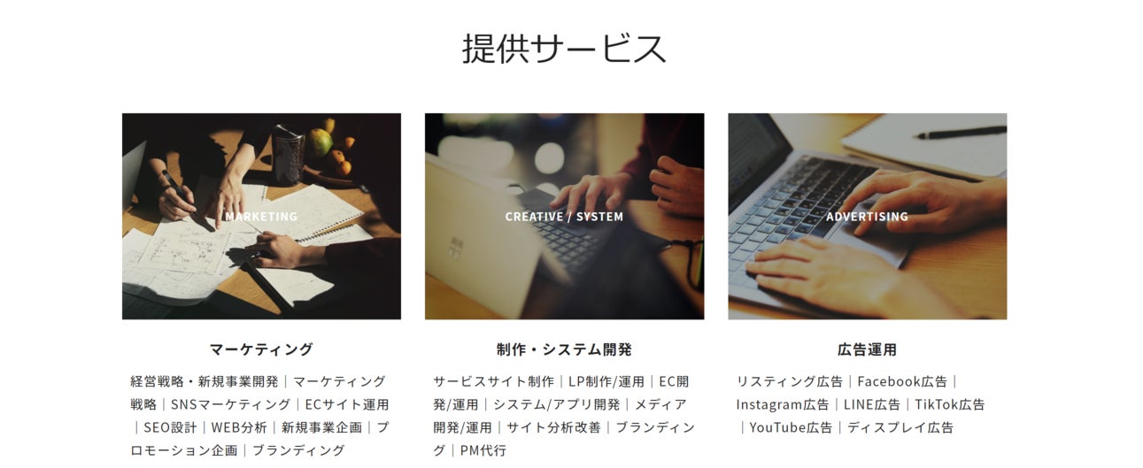 支援領域:HP・サービスサイト制作/LP制作・運用/EC開発・運用/システム・アプリ開発/メディア開発・運用/サイト分析改善/PM代行