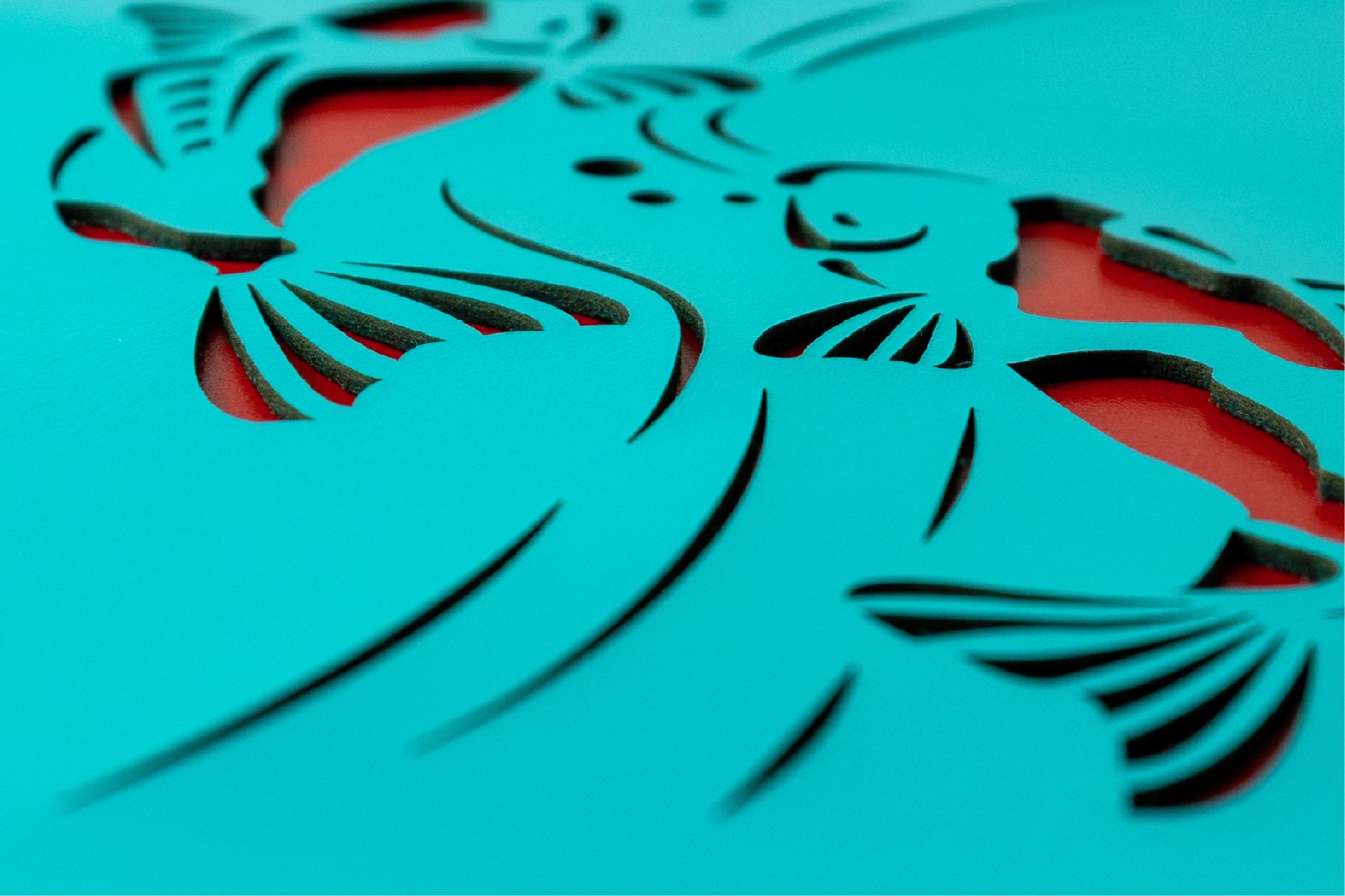 「鯉」は優雅に泳ぐ様子を表現し、青空と澄んだ水といった爽やかさのある天色(あまいろ/ブルー)と、暮れ方の空を映し出す水面のような紅(べに/レッド)の2色展開。