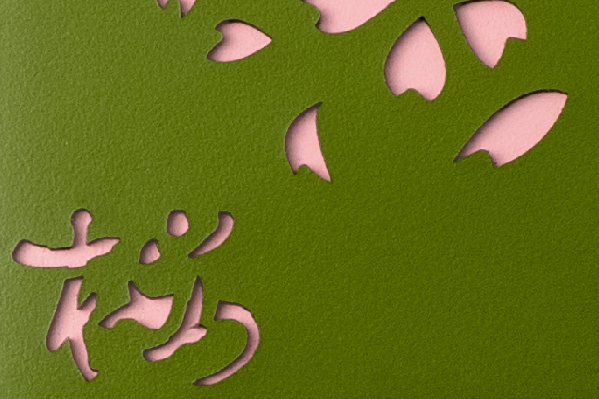「桜」は満開の花びらをイメージし、温かく心地良い日差しの中を彷彿とさせる鶯色(うぐいすいろ/グリーン)と、おぼろのかかる幻想的な夜のような青褐(あおかち/ネイビー)の2色を用意しました。