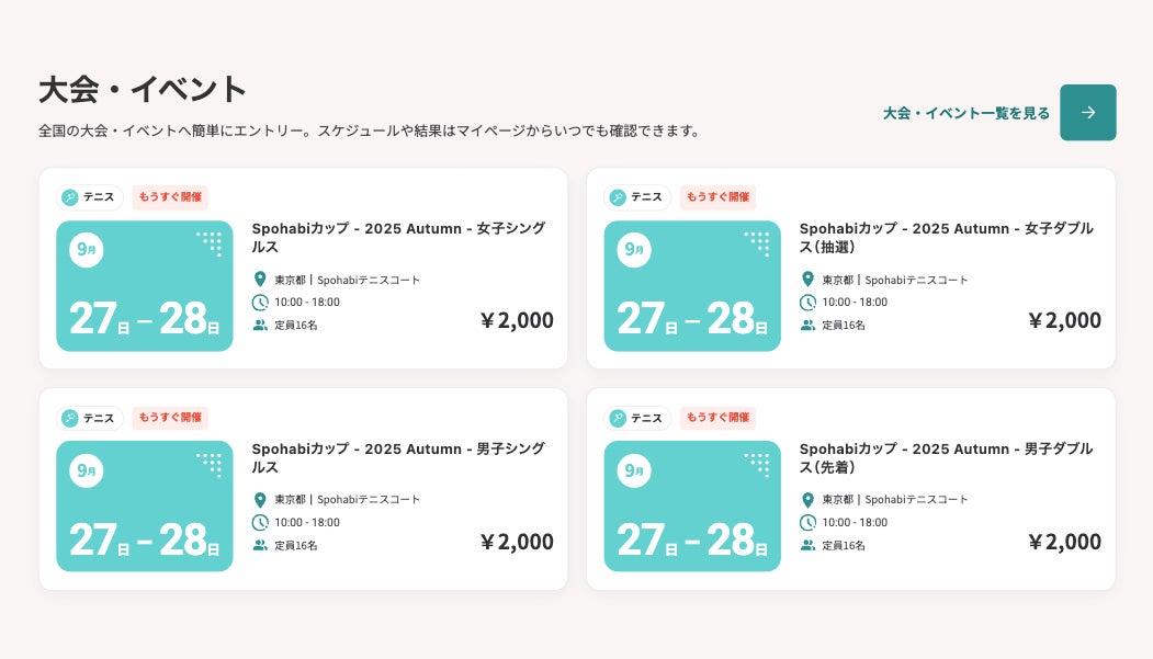 全国のスポーツ大会情報を確認できます。専用ページに遷移すると、簡単に検索・申し込み・決済が可能です。今後、各種スポーツの大会を掲載予定です。