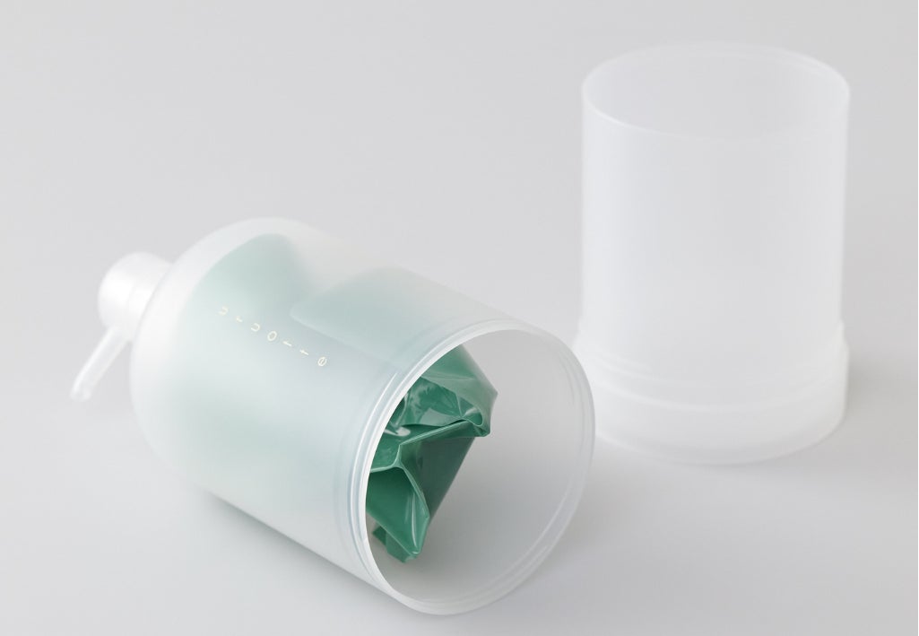 コンディショナーを作らずシャンプー1本でしっとり洗える仕様により、プラスチック容器の使用を半減できること。大容量サイズにプラを約90%カット*できるカートリッジ式の「エコボトル」を採用していること。