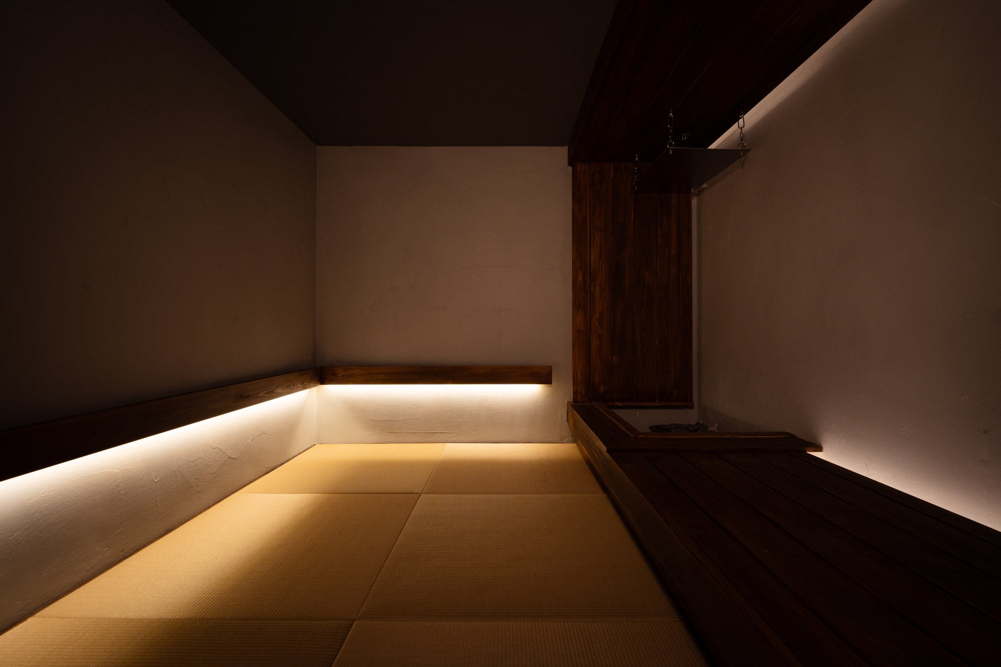 最大8名まで入れるサウナに、休憩スペースには広々とした畳スペースとチェアを配置し、複数名でもゆったりとご利用いただけることを想定。水風呂は水深にもこだわった檜浴槽を配置。都心の真ん中で、隠れ家の様な落ち着いた雰囲気の中、大切な誰かとの時間や、サウナミーティングなどのビジネスシーンでも利用可能。