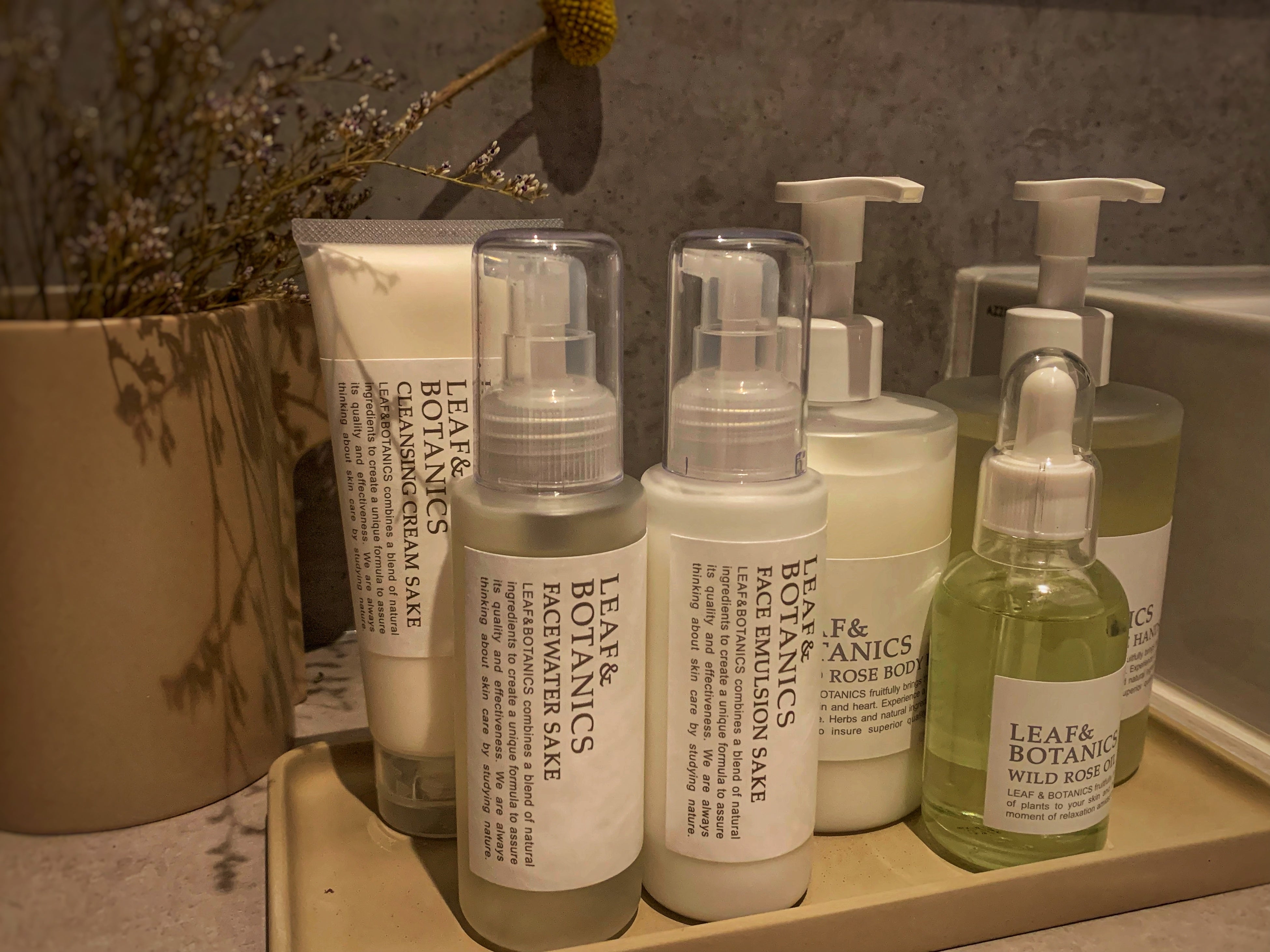 レンタルタオルはもちろんのこと、各種アメニティをご用意。バスアメニティ&スキンケアアメニティには女性にも喜んでいただけるようにLEAF&BOTANICSの製品を採用しています。