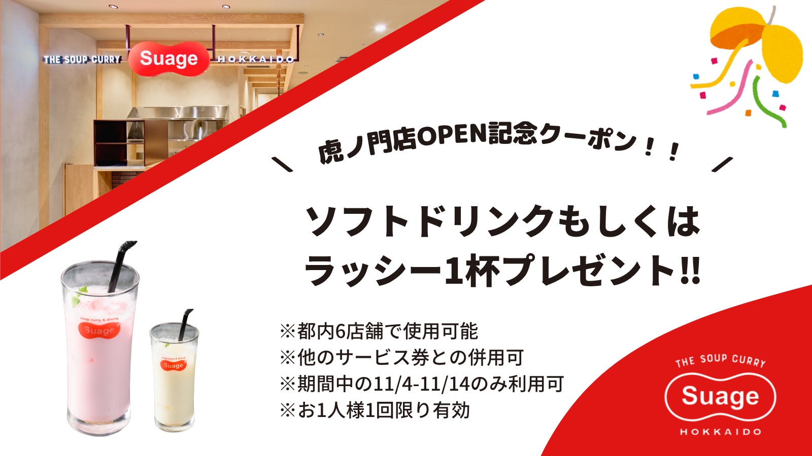 北海道スープカレーSuageを提供する株式会社Suage Japan(代表取締役:竹下 遼 所在地:東京都渋谷区)は、2025年11月4日(火)に虎ノ門アルセアタワ―内に都内6店舗目となる虎ノ門店をオープン致します。