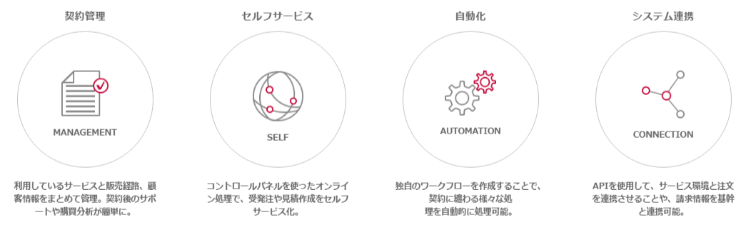 AXLGEARはサブスクリプションモデルのサービスを管理するプラットフォームです。クラウドサービスのサブスクリプションモデルは、人手を最小化しつつお客様の満足度を向上させ、かつスムーズに利用者数を拡大する有効な手段として、多くの企業で採用されています。AXLGEARは、これらサービス品質向上を提供するツールであることはもちろんのこと、これまでの仕組みには無い売上拡大(新規獲得・利用継続・アップセル)、利益最大化(営業、業務、サービス、管理のコスト削減)機能を実装し、サービスベンダーのビジネス拡大に貢献するバックエンドツールとして高く評価されています。