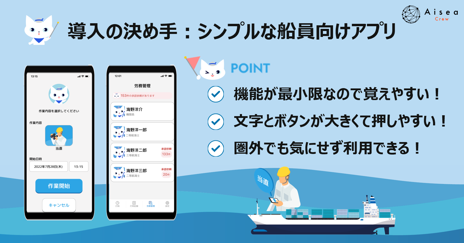 当社が提供する労働時間管理システム『Aisea Crew』は、船員向け打刻アプリと陸上管理者向けWebシステムの連携により、カンタンかつ適切な船員労務管理を実現するサービスです。機能を最小限に絞り、ボタンタップのみで簡単に操作できる船員向けアプリに強みがあることから、田渕海運は2ヶ月のトライアルを経て運用可能との判断に至り、全隻にAisea Crewを導入致しました。