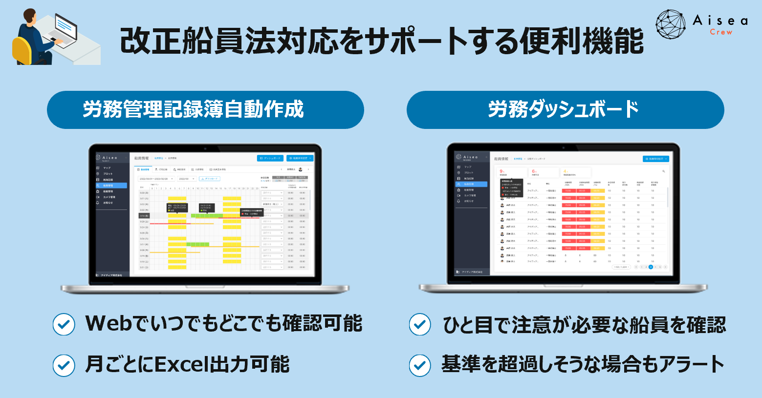Aisea Crewの導入により、労務管理記録簿は自動作成の上クラウドで自動保管されるため、陸上管理者側の管理工数が大幅に削減されました。加えて、陸上管理者向けWebシステムの労務ダッシュボード機能で過重労働の恐れがある船員がアラート一覧で確認できるため、速やかに過労防止措置を取ることができるようになるなど、デジタル技術を活用することで、業務負荷の大幅な削減とともに、船員の働き方改革を推進する体制を整えることができました。