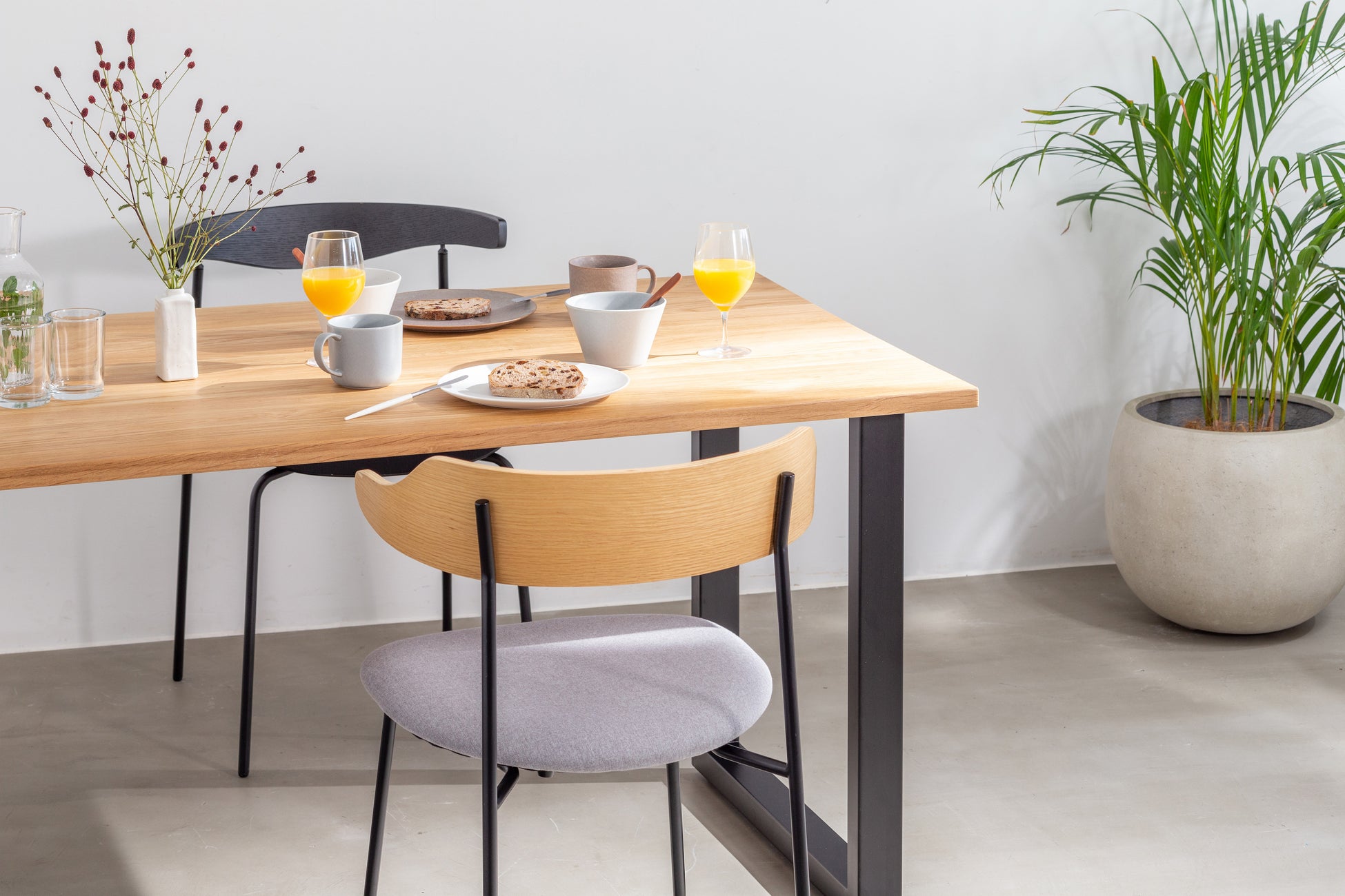 アイアン脚とのコーディネートにより、オークの素朴な風合いを程よく引き締めています。鉄脚にすることでナチュラルでありながらもスタイリッシュ+モダンな印象に仕上げています。