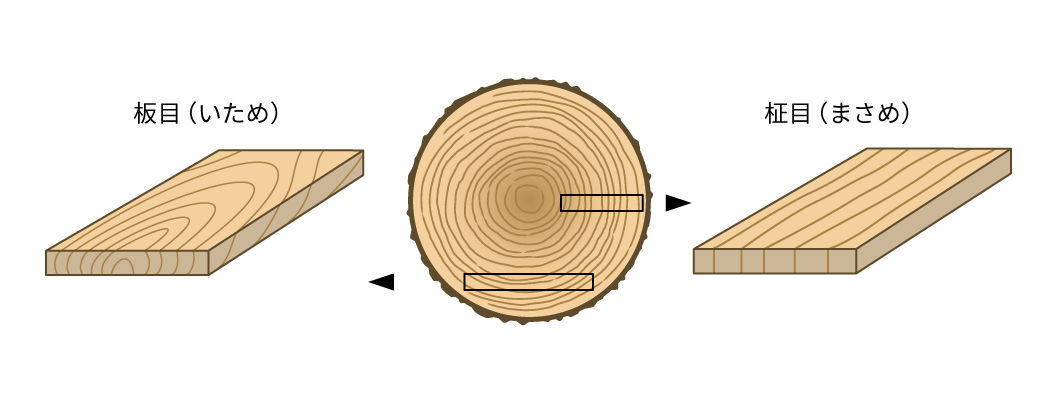 また、加工方法により2種の木目を楽しむことができます。「柾目(まさめ)」では直線的でまっすぐに流れる清楚な木目が、「板目(いため)」では曲線が描く豊かな表情が現れます。