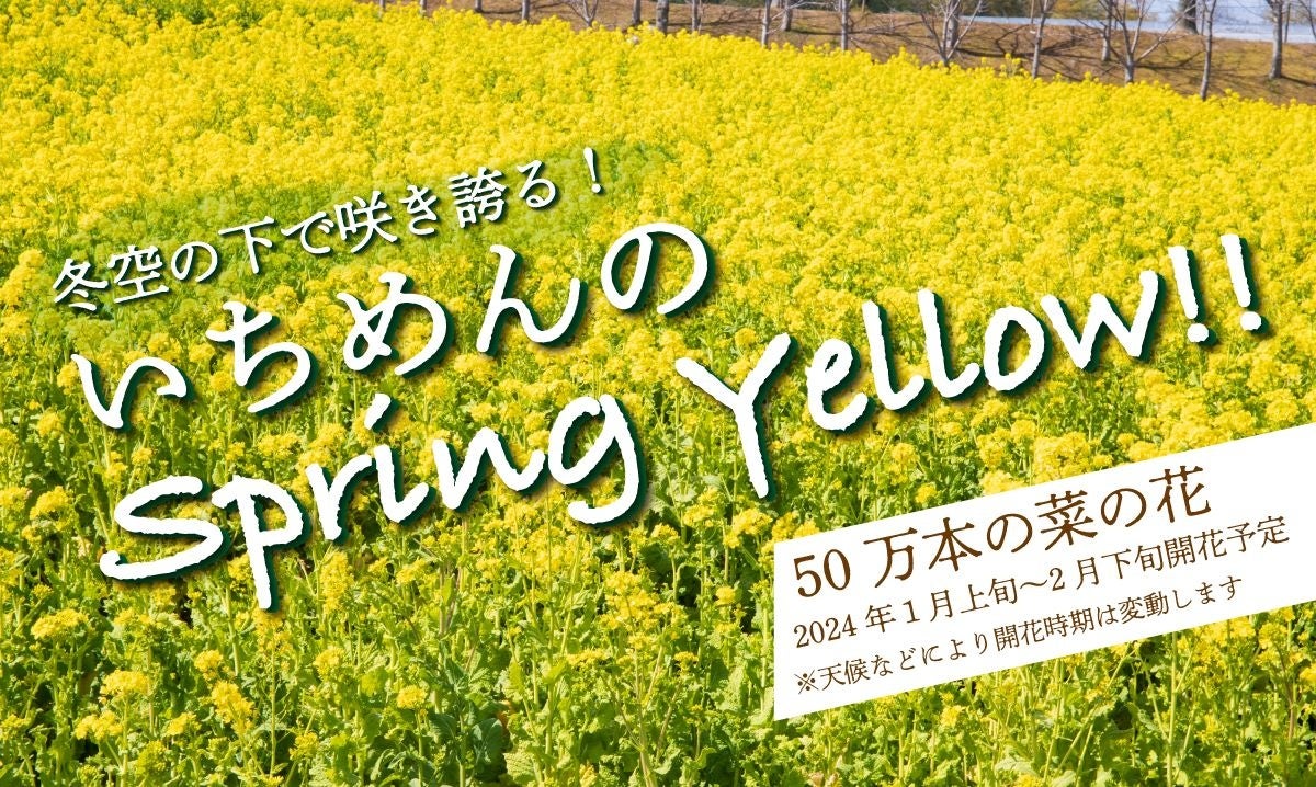 冬空の下、黄色い菜の花が花畑一面に咲き乱れます。