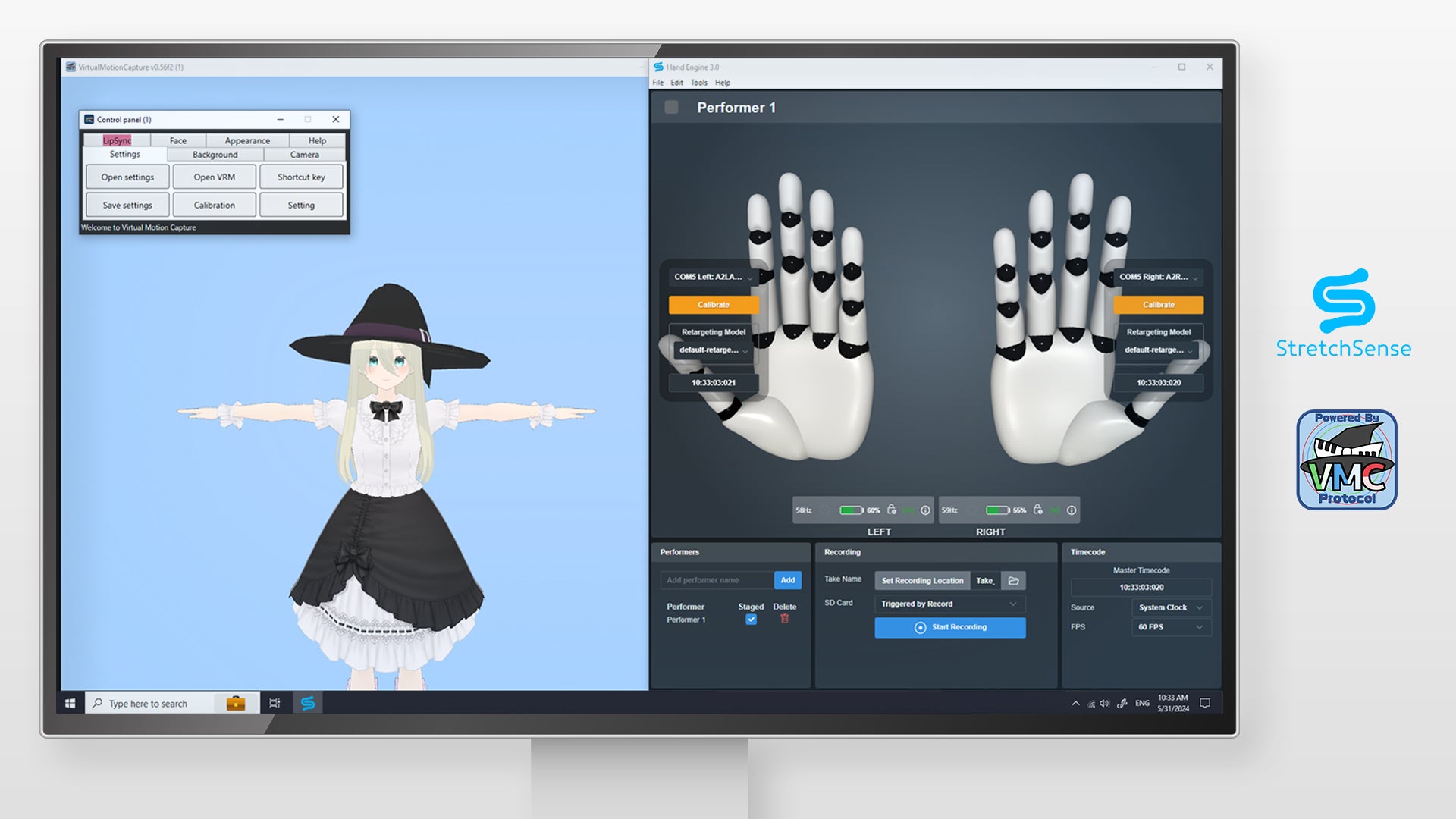 「Studio Glove」には専用Windowsソフト「Hand Engine(Lite版)」のライセンスキーが付属しています。「Hand Engine(Lite版)」では、グローブの初期設定(キャリブレーションなど)の他に、バーチャルモーションキャプチャー(VirtualMotionCapture、通称「ばもきゃ」)、Warudo、Unity、Unreal Engineへ指の動きをリアルタイムでストリーミング(同期)する機能が提供されます。