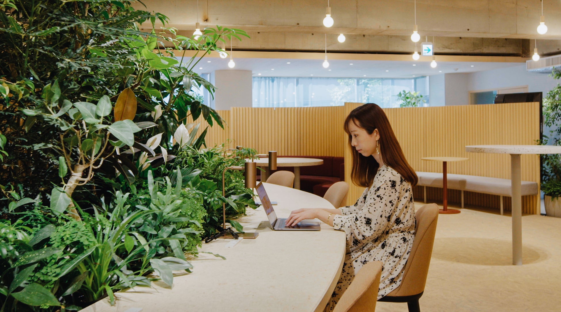 Kant.は、ワークラウンジ、オフィス、カフェ&ミュージックバーラウンジで構成される複合施設です。オールフリーアドレスの緑あふれる開放的なワークラウンジは、さまざまな目的・利用形態に応じて柔軟に利用いただけます。