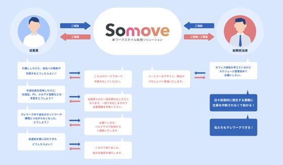 本サービスは、総務担当者の「組織戦略の企画立案に専念したい」「オフィスの効率的な活用方法、社員が働きやすい環境を整えたい」「社内の様々な手続きや申請で社員からの質問を効率的にさばきたい」「文具などの備品を一括管理してコストを削減したい」など、さまざまな課題に対して、「Somove」に窓口を一本化することで、従業員が問い合わせや申請先に迷うことがなくなり、同時に総務担当者は問い合わせ対応に煩わされることなく、コア業務に専念することができるようになります。