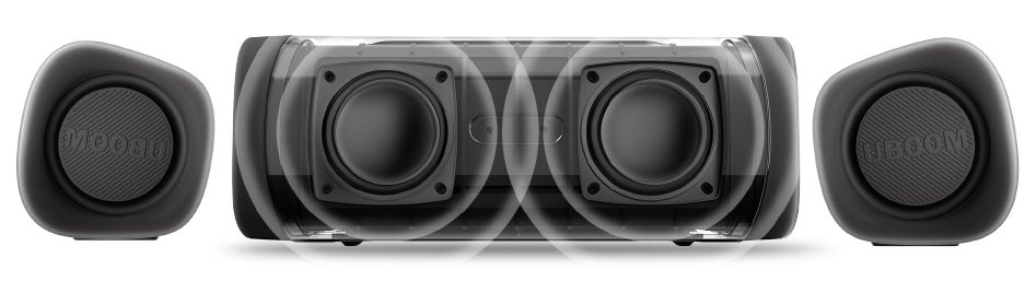 音へのこだわりはEarFunのアイデンティティです。ドライバーには新開発の55ミリ径振動板をデュアルで搭載しました。定格14W、2基合計で24Wという出力にくわえ、低域を増強するパッシブラジエーターを左右両端に配置した「デュアルパッシブラジエーター」、DSP技術とEarFun独自の低音増強技術「JumboBass™テクノロジー」により、ペットボトル飲料ほどのボディサイズとは思えない骨太な低域と臨場感あふれるサウンドを実現します。
