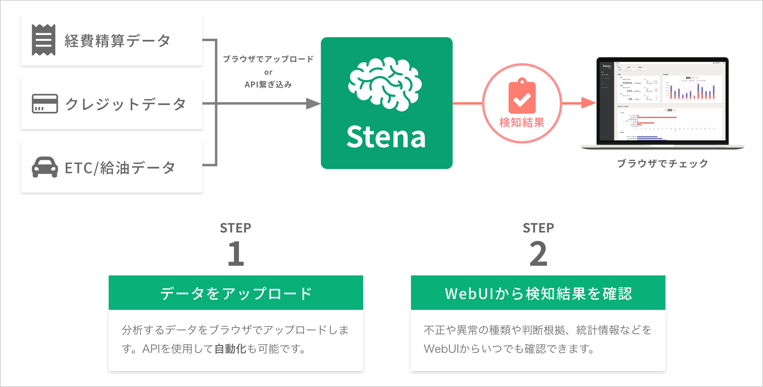 今回、従来の「Stena Expense」の高精度な検知機能はそのままに、企業の担当者様自身で登録、設定やデータ投入を行うことができる”SaaS型の安価プラン”を追加しました。
