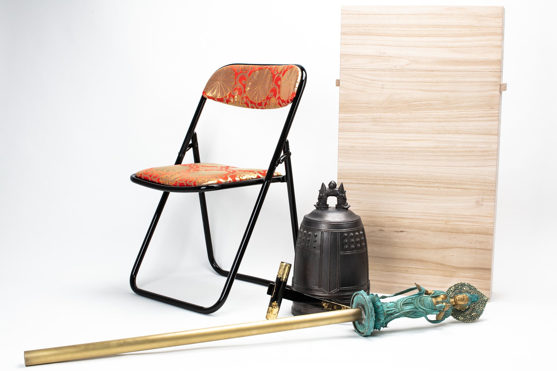 伝統技術をあしらった『興器』は「パイプ椅子」「仏像」「半鐘と木槌」の3点が制作され、仏具職人による手彫りの彫金、実際の仏像にも使用される酸や炎を用いた伝統的な着色技法、金粉や金箔で細工する蒔絵の技術など、様々な技術が使われたものとなっており、いずれも伝統工芸職人の高い手仕事によって制作されております。
