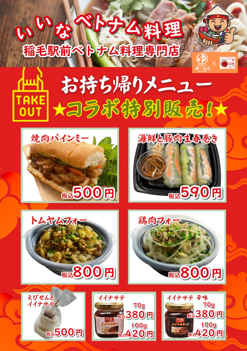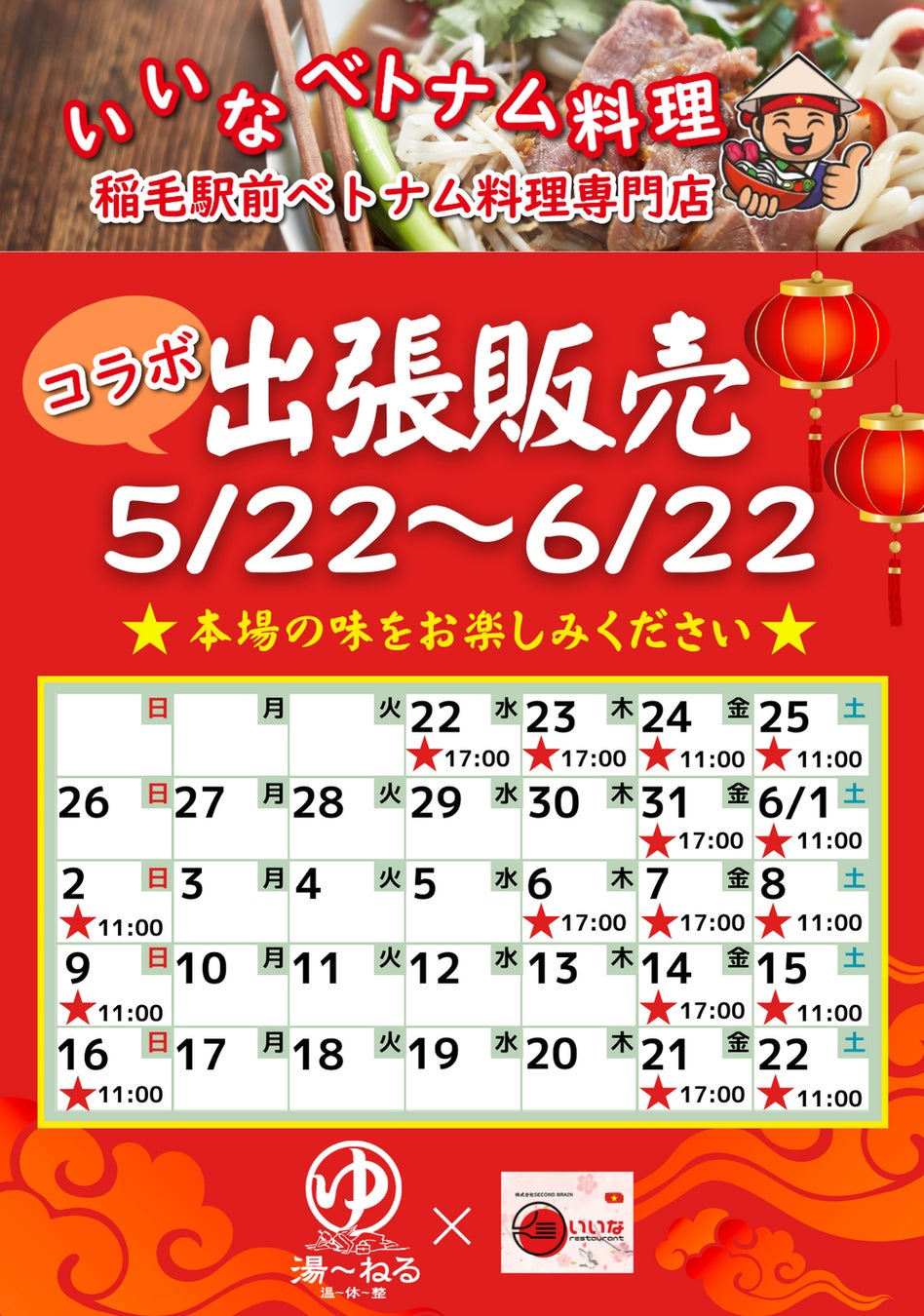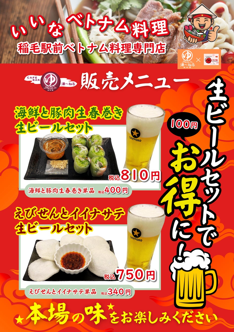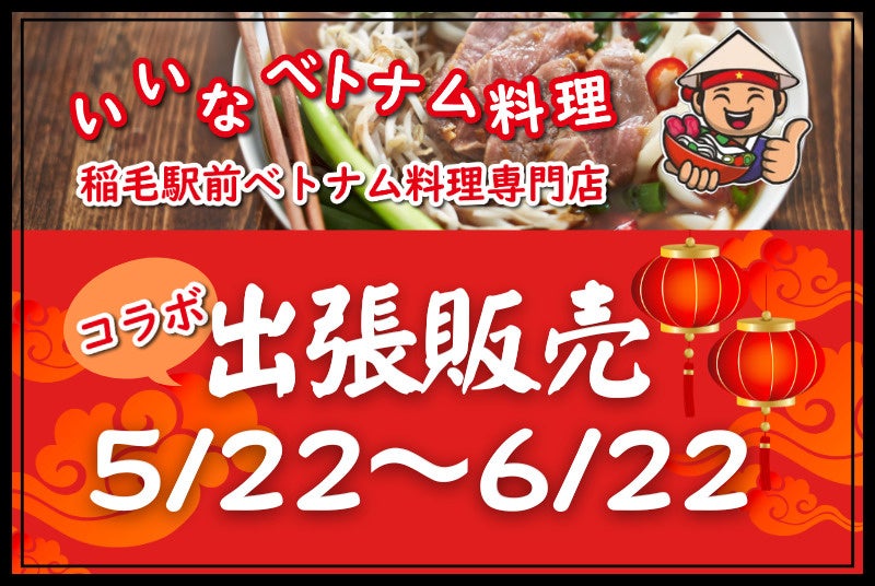 天然温泉 湯〜ねる(千葉県習志野市、代表:金光淳用)にて5月22日(水)より千葉市稲毛区にある人気ベトナム料理店「いいなベトナム料理」が出張販売を行います。この特別な機会に、ぜひ本場の味をお楽しみください。