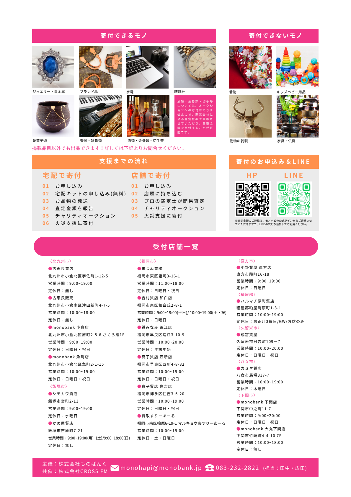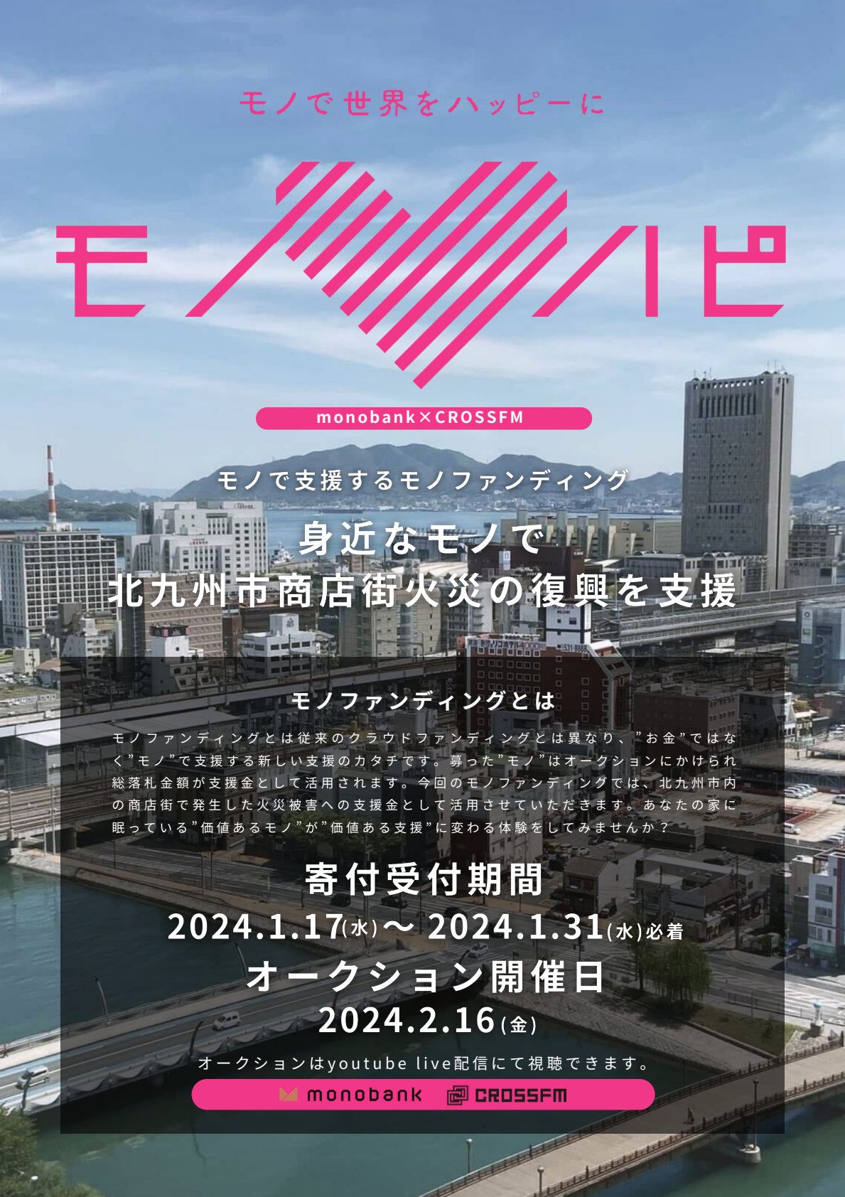 「世界中のライフスタイルにリユースを。」をVISIONとして掲げる株式会社ものばんく(商号:monobank/本社:山口県下関市、代表:吉田 悟)は、北九州市鳥町食道街で発生した大規模火災の復興を支援するため、株式会社CROSS FMと共同で、使わなくなったモノで支援できるモノファンディングプロジェクト「ものはぴ」を立ち上げ、モノの募集を開始しました。募集期間は2024年1月17日(水)から1月31日(水)、募ったモノは当社が運営するオンラインオークションへ出品、その落札金額を魚町火災復旧支援の会へ寄付いたします。