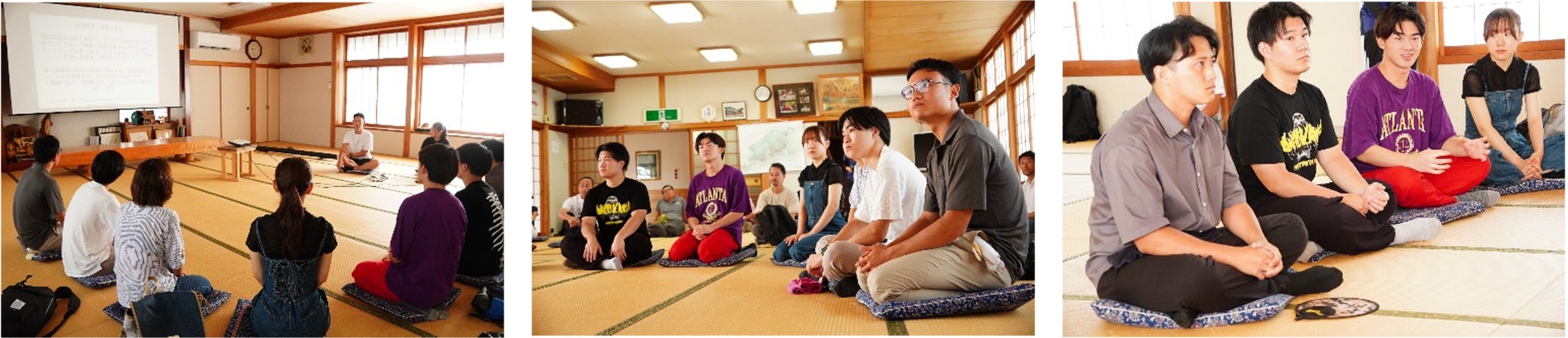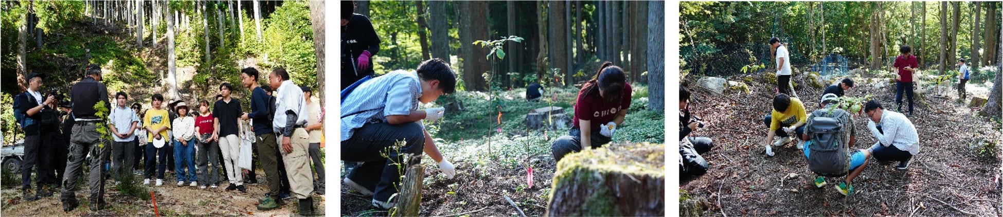 本プログラムでは“次世代に環境保全の大切さをつなぐ”ことをテーマに、地域の「課題」と「魅力」を発見・体験するワークショップや地域住民との交流プログラムを実施しました。面積の90%以上を森林が占める中、人工林率がその78.6%*1にもおよぶ智頭町は、林業の担い手不足に伴う森林整備が課題になっています。その中、1日目は林業家兼智頭町地域林政アドバイザーを務める國岡将平*2氏と山本福壽*3元鳥取大学教授によるナビゲートのもと、芦津渓谷の豊かな自然環境資源の天然林を視察。その後、2022年から森林整備活動を行っている「キャロウェイの森」で、学生たちは天然林で採取した種子を植える作業を行い、多様性のある森づくり*4に取り組みました。また、視察を通じて、森林における鹿害の深刻さを目の当たりにし、獣害対策の重要性についても学びました。その後、閉校した旧那岐小学校を改装して新たにコミュニティスペースとして生まれ変わらせた「ナギノ森ノ宿」にて芦津財産区議会を含む、地域コミュニティとの交流会を行い、地域住民が感じている地域課題について理解を深めました。