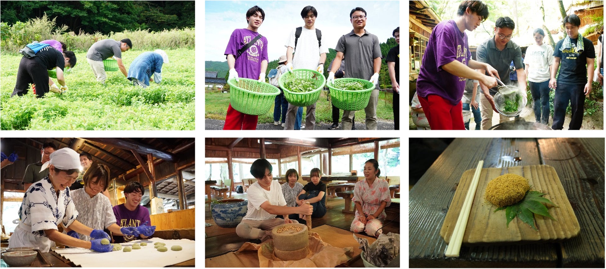 芦津渓谷にてよもぎ摘みや山菜採りを行ったほか、「みたき園」のサポートの元、よもぎ餅作りに挑戦しました。薪の火付けから、灰汁を使ったよもぎのあく抜きなど、餅づくりのすべての工程を自分たちの手で行いました。