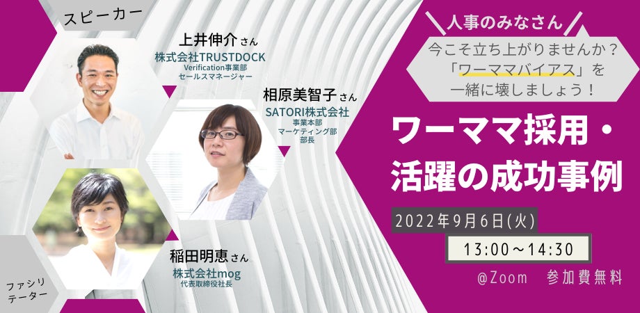 ワーキングママのキャリア支援事業を展開する株式会社mog(本社:東京都渋谷区、代表取締役社長:稲田明恵、以下mog)は、積極的なワーママ採用や活躍支援を実施するSATORI株式会社と株式会社TRUSTDOCKとのコラボ企画として、ワーママに対するネガティブなバイアスを払拭するためのオンラオインイベントを開催します。