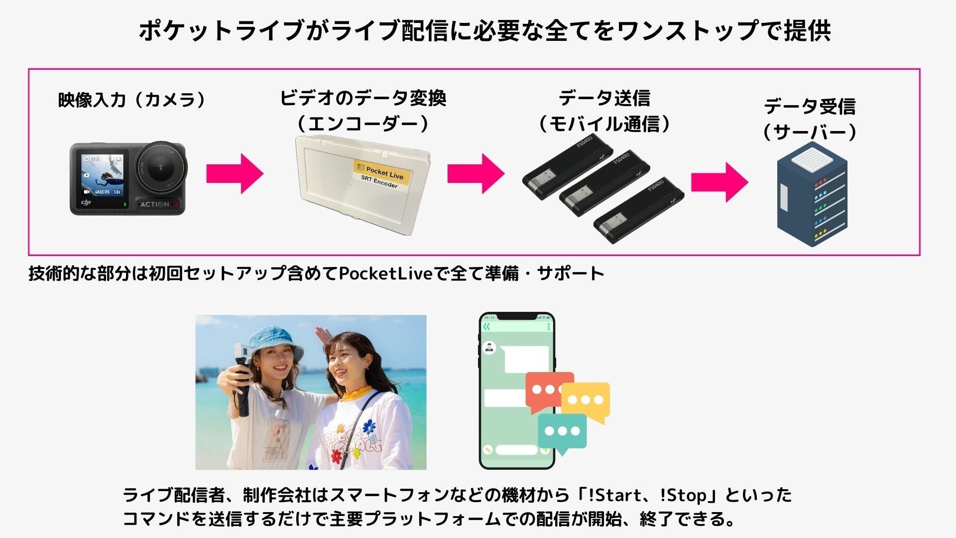 上記の図で示すように、カメラ、エンコーダー、モバイル通信、サーバーといった技術的な部分を携帯型ライブ配信キットPocketLiveとしてワンストップにまとめて導入部分から提供・サポートするため、ライブ配信者や制作会社は、技術的な内容を心配することなく、モバイル通信が繋がるエリアであれば、どこでも、簡単に高品質なライブ配信を、またライブ配信を活用したサービスを提供できます。