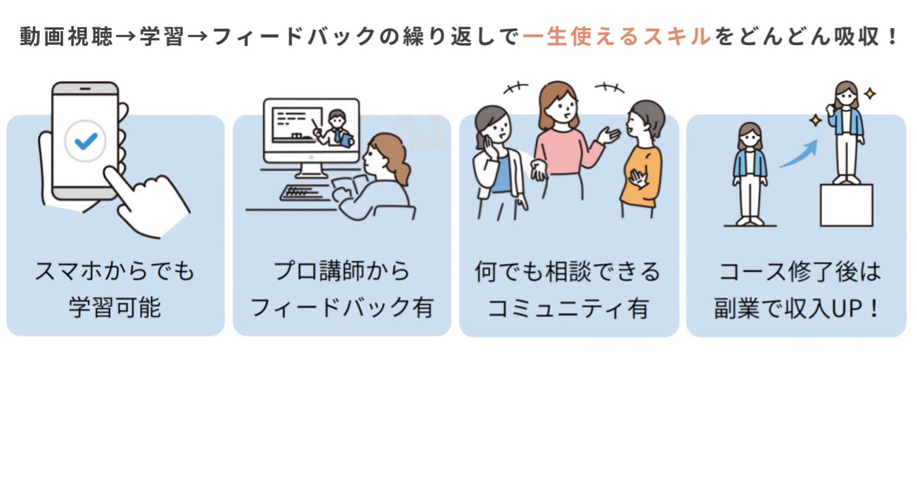 動画視聴→学習→フィードバックの繰り返しで、一生使えるスキルを吸収できるように教育伴走します。