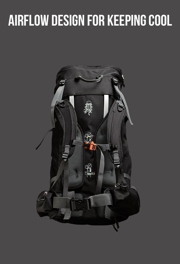 耐久性を重視し、一般のバックパックよりもやや厚手な生地を使用し、素材としては、耐久性に優れた900Dポリエステルを採用しました。摩擦性に優れています。900Dポリエステル素材は、冒険の際にギアがさらされる過酷なチャレンジや摩擦、その他の要素に耐える事ができます。バックル、ジッパー、プラー、アクセサリーには、アウトドア業界向けの高級トリムやアクセサリーメーカーとして知られるSBS社を採用しました。