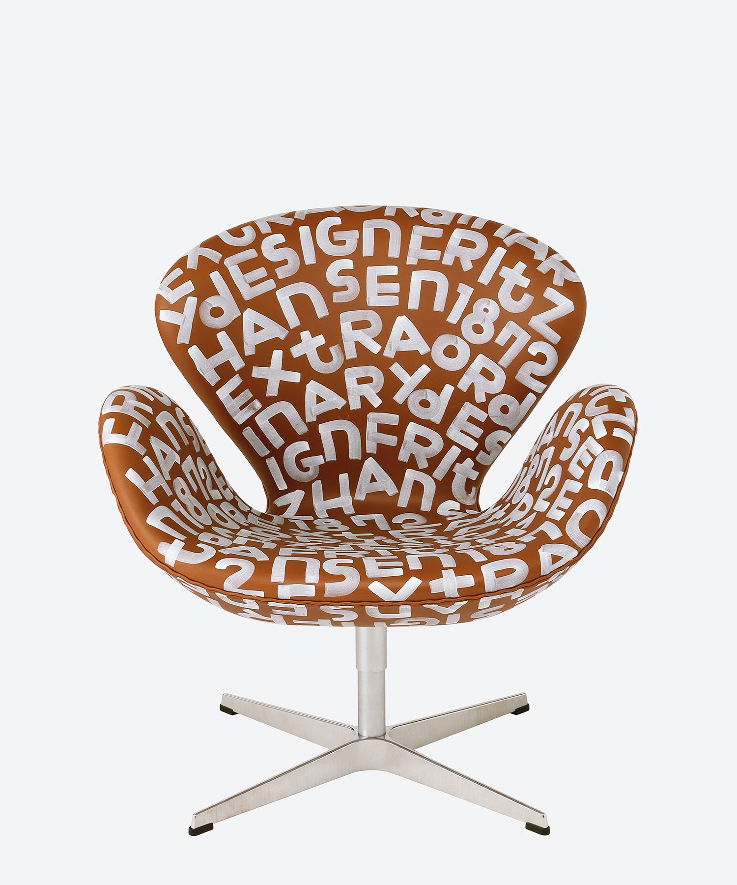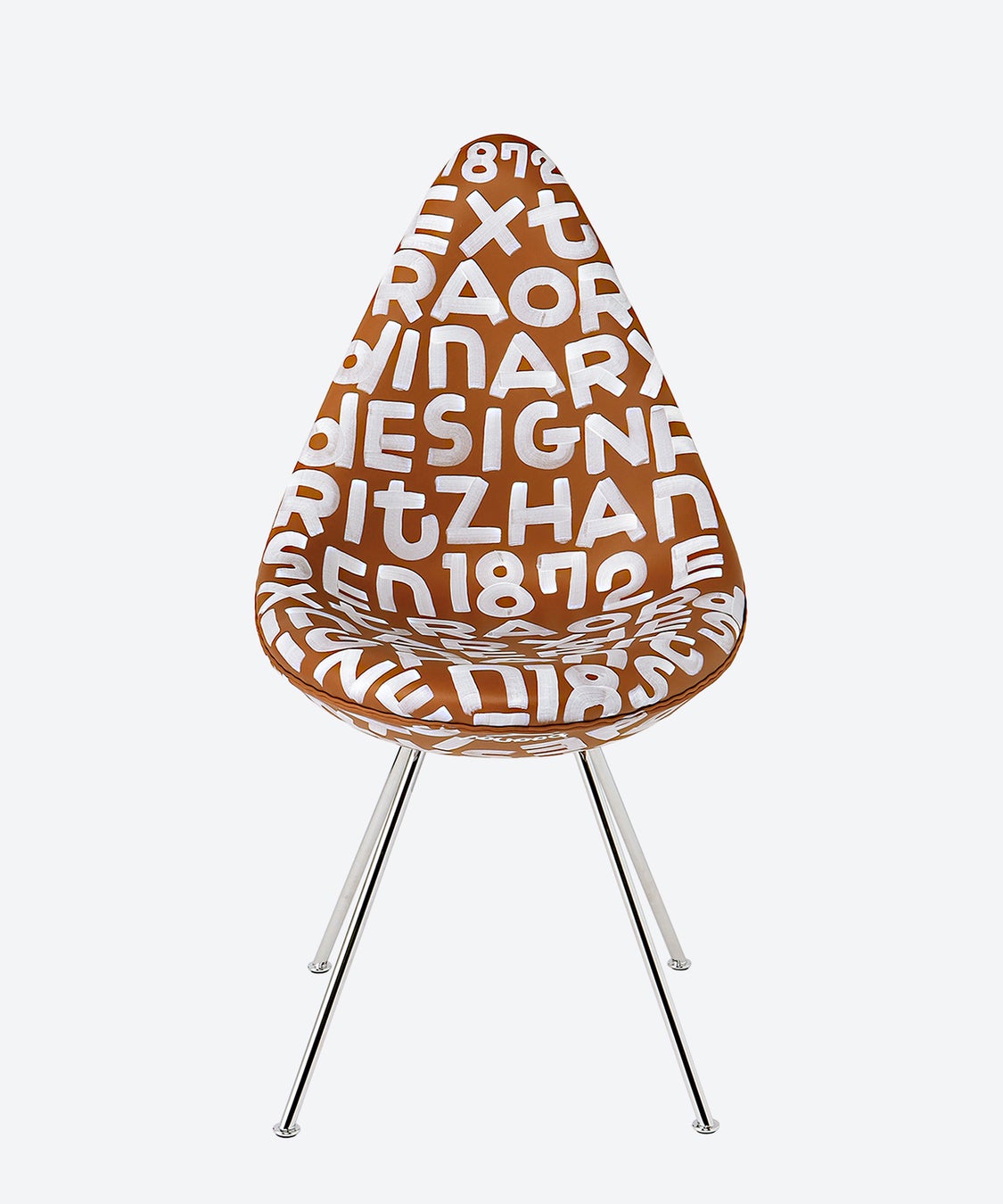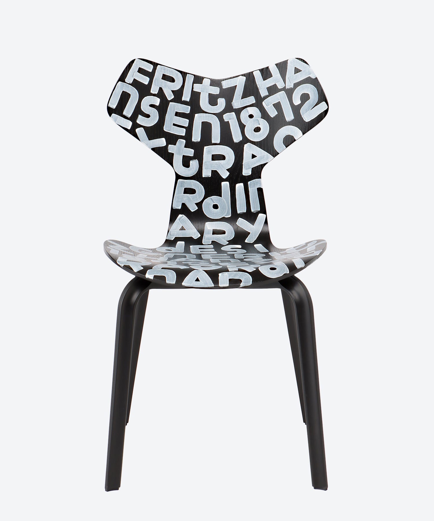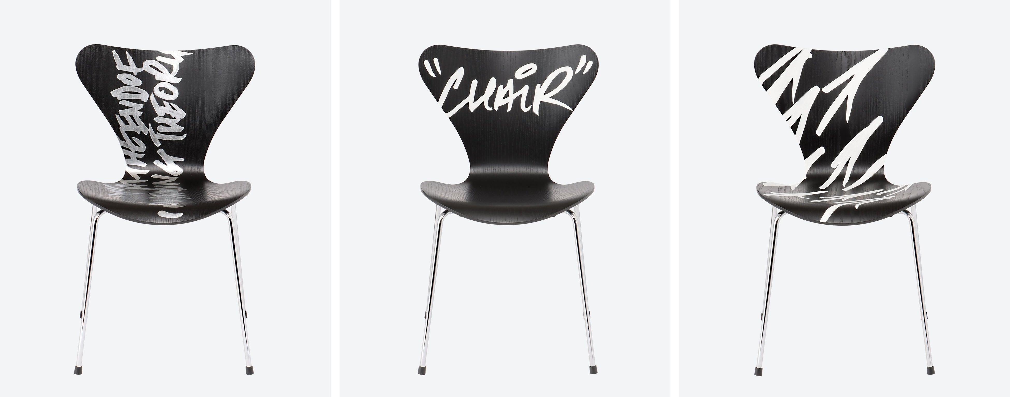 フリッツ・ハンセンとのコラボレーションでは、アルネ・ヤコブセンの椅子をキャンバス代わりに独自の筆致でぎっしりと文字が描かれました。フリッツ・ハンセンというブランド名に加え、キーワードである「EXTRAORDINARY DESIGN」や創業年の「1872」などのフレーズが見えます。