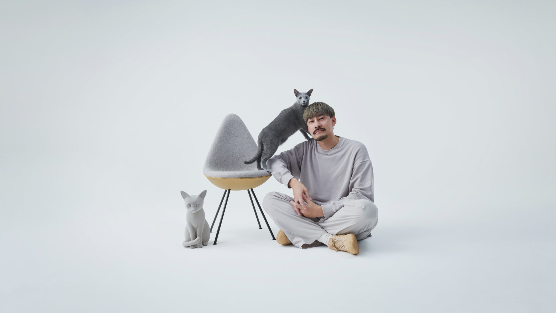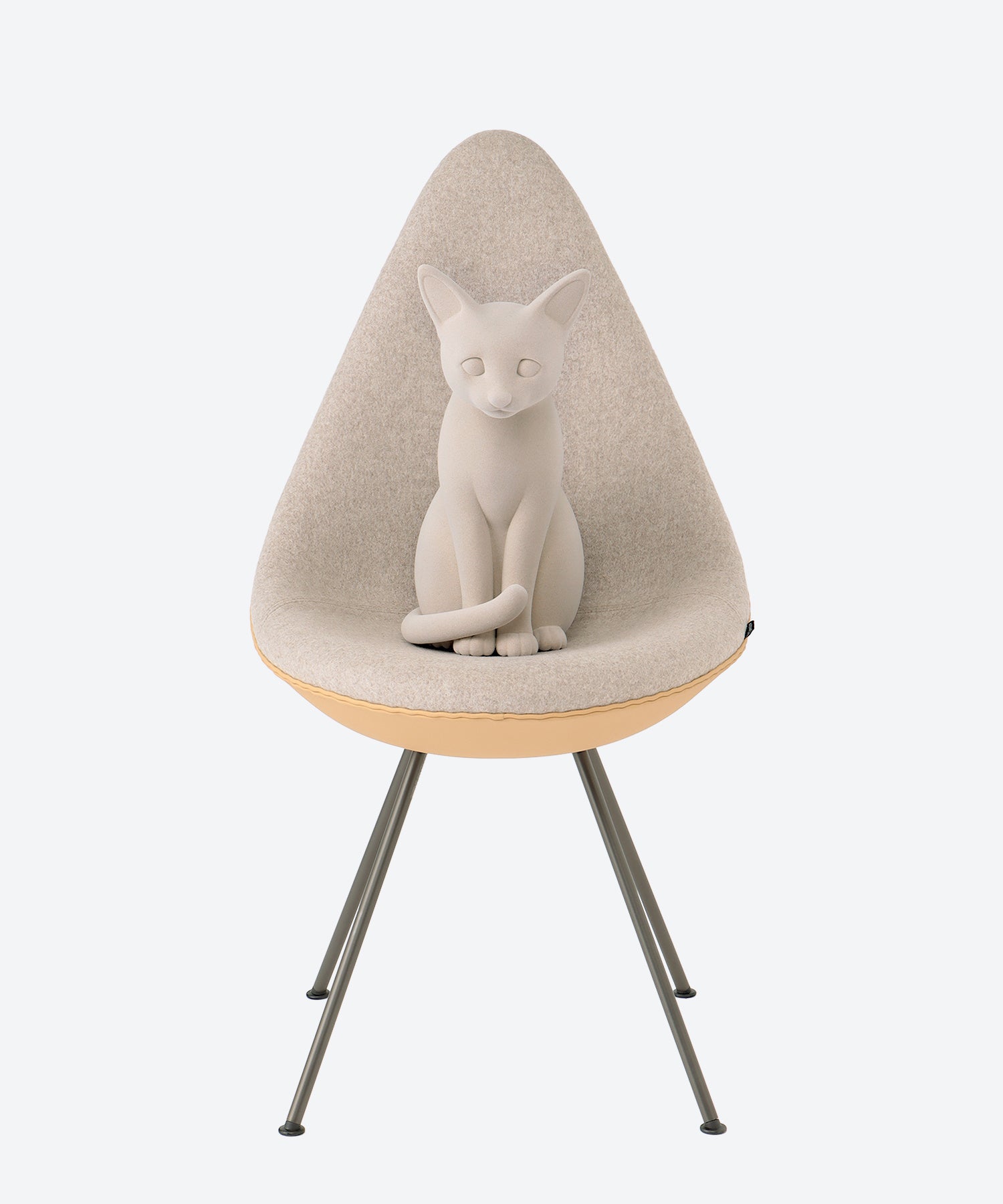 今回のフリッツ・ハンセンとのコラボレーションでは、このブランドのファンがもっているイメージを大切に考えながら、自身のエッセンスを加えるような感覚で制作に臨んだそうです。モチーフに選んだのは、約1年前から自宅で飼っているロシアンブルーの「もろこし」。橋爪さんの近作にもよく登場している猫で、椅子のシートに丸くなって座るのがとても好きなのだとか。アルネ・ヤコブセンの「ドロップチェア」の上に猫のオブジェを載せたのは、オリジナルの完成度を尊重したからでもあるそうです。