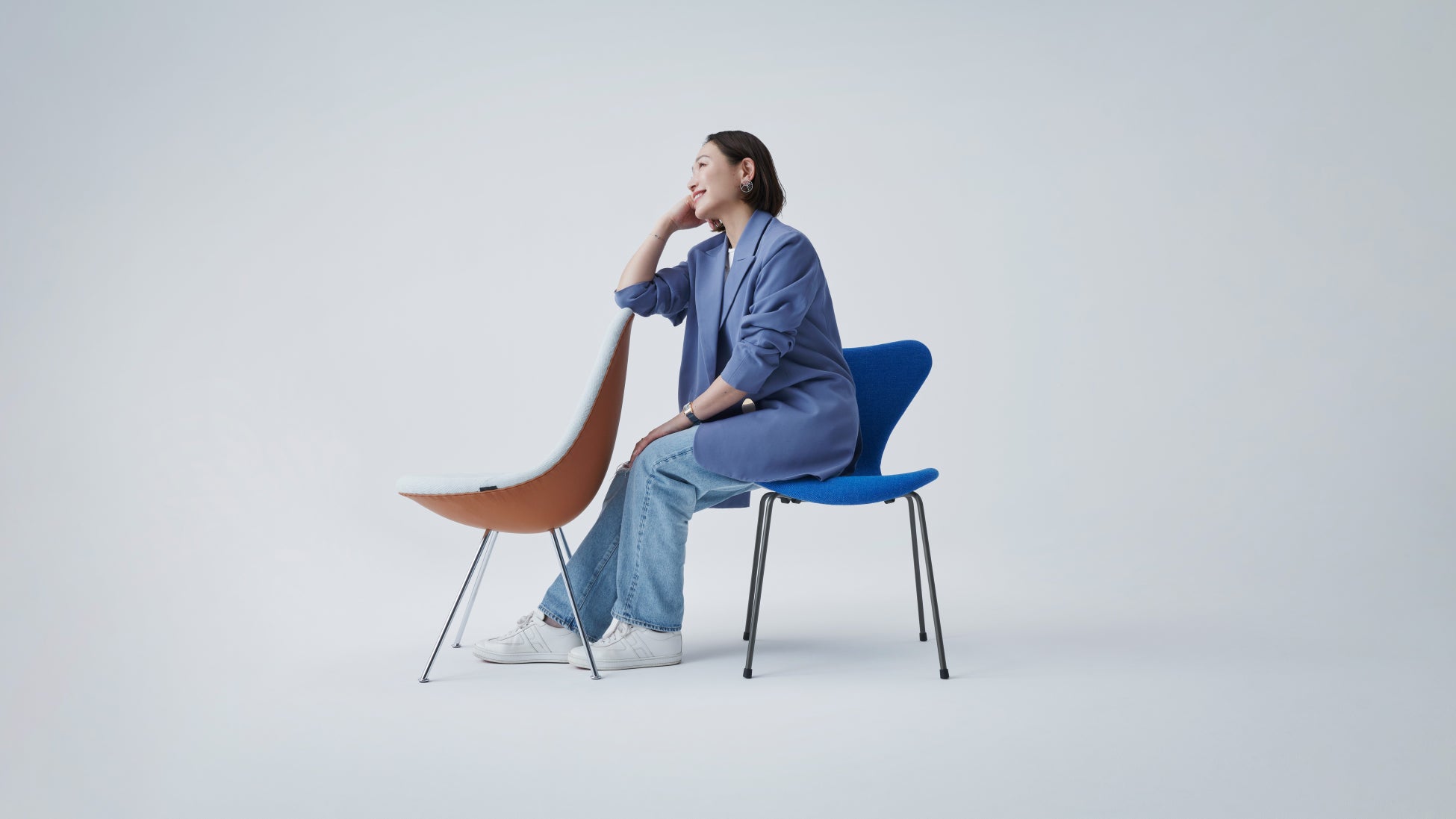 そんな黒沢さんは以前からフリッツ・ハンセンが大好きで、自宅でも椅子「セブンチェア」を愛用しています。今回は自身のテーマカラーでもあるブルーを取り入れ、アルネ・ヤコブセンの2種類の椅子を新鮮に彩りました。