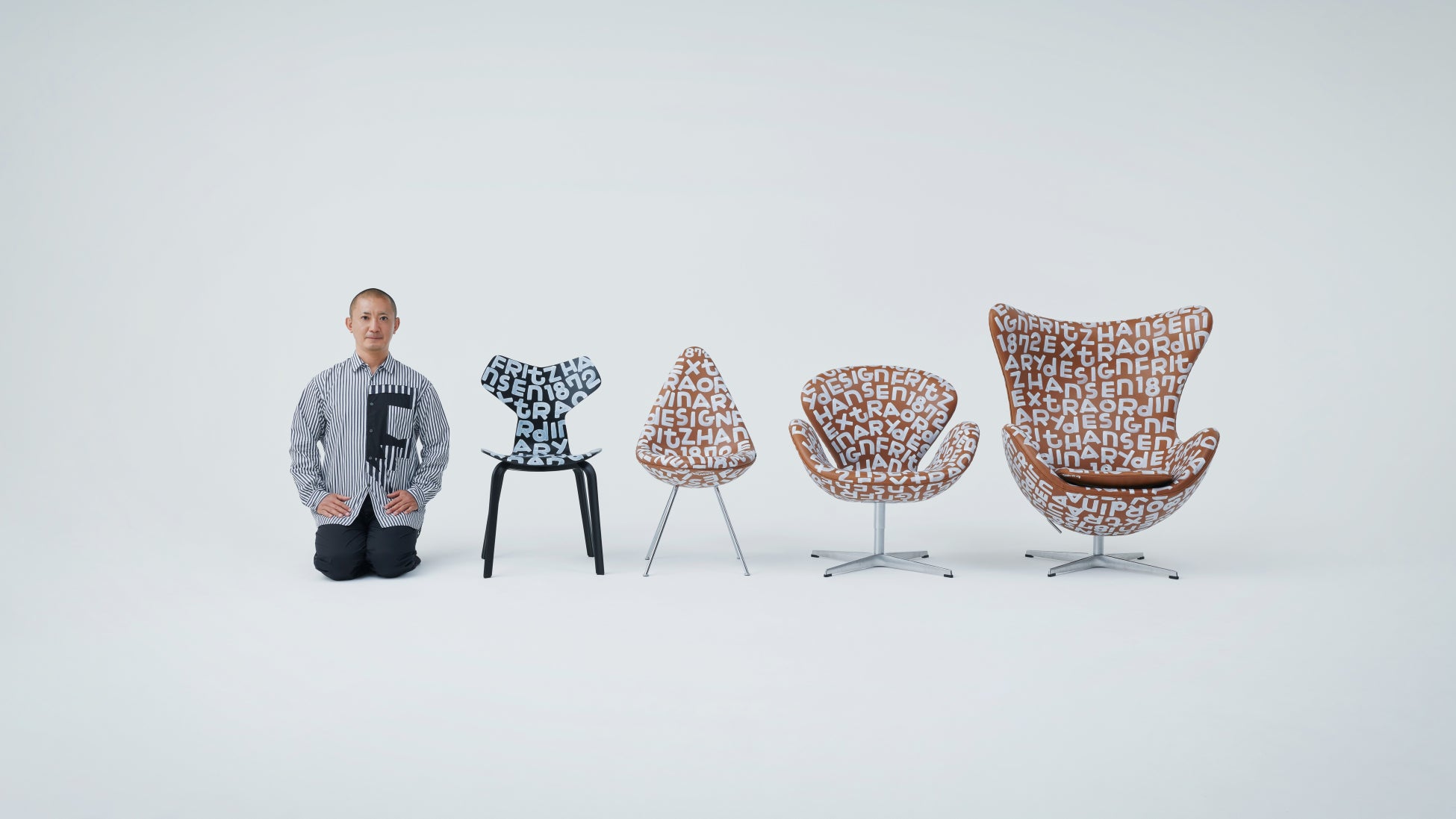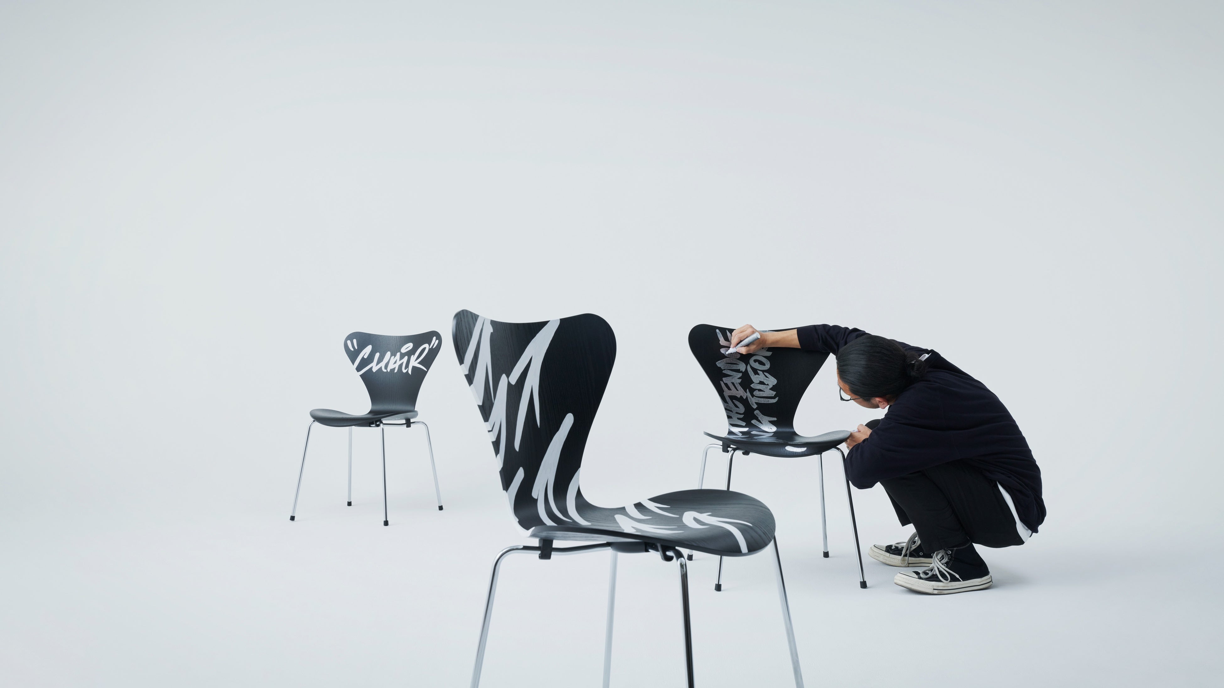 フリッツ・ハンセンとコラボレーションするにあたり、最初に感じたのは「おもしろそう」。自ら経営していた店の壁や床に、頭の中に湧いてくるイメージを言葉に変換しながら「ラクガキ」を始めた頃の楽しさや気持ちよさが、今につながっているのだといいます。アルネ・ヤコブセンがデザインしたSASロイヤルホテルのラウンジセットとジャムセッションするように、今回の作品を完成させていきました。