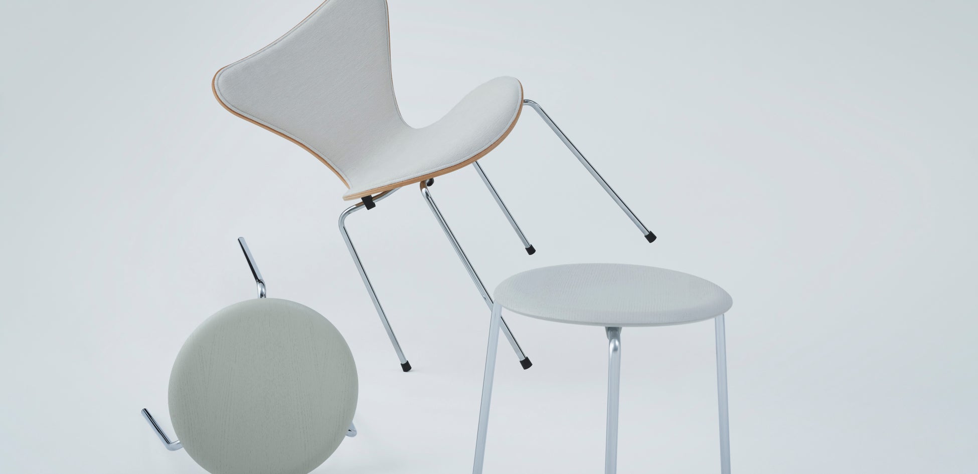以前からフリッツ・ハンセンに憧れがあったという岩井さんは、オーラリーのレディースの洋服のために開発したテキスタイルを「セブンチェア」の張り地として使用。また絶妙のベージュとグレーを用いた2種類の「ドットスツール」も手がけています。1脚ずつでも魅力的ですが、3脚揃った色彩のバランスにはいっそうのオーラリーらしさがあります。