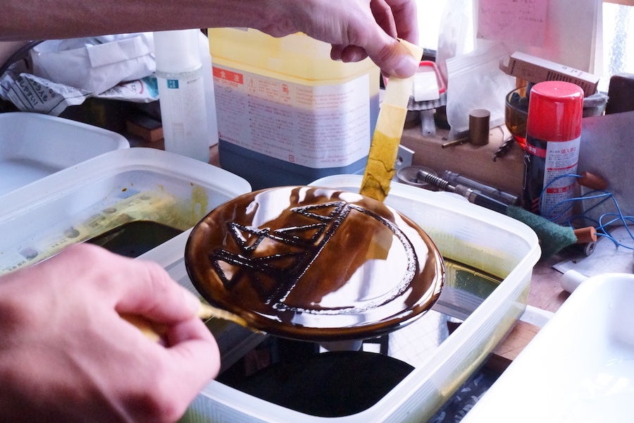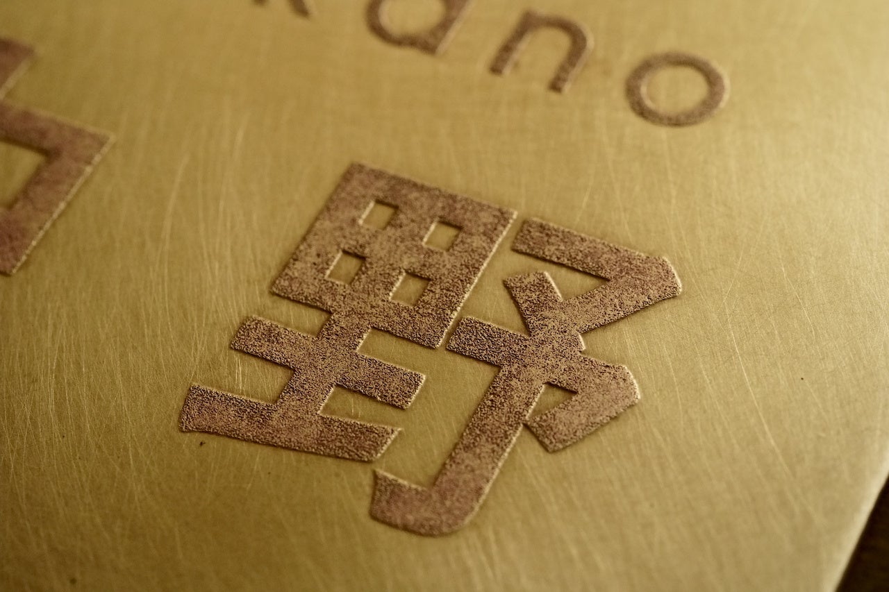 銅版画の技術を応用し、マスキングした金属板を腐食液に浸して溶かすことで、文字やロゴ部分だけを浮き出します。