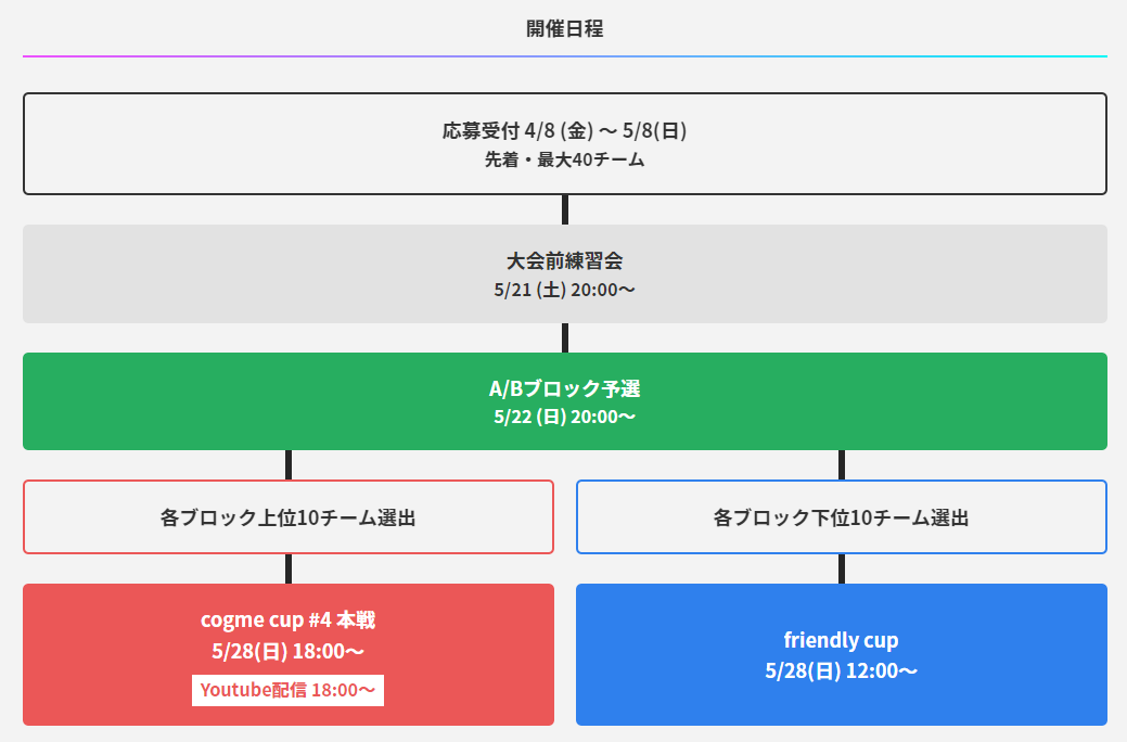 第4回目の開催となる今大会では、大会前練習会を設け、全40チーム(企業eスポーツ部)での開催となります。翌日は予選A,Bブロックでそれぞれ数試合行い、各ブロックの上位10チームが生配信ありの本戦であるcogme cup #4本戦へ出場する権利を得ます。また惜しくも予選リーグで上位10チームに入れなかったチームは生配信なしのfriendly cupに出場する権利を得ます。