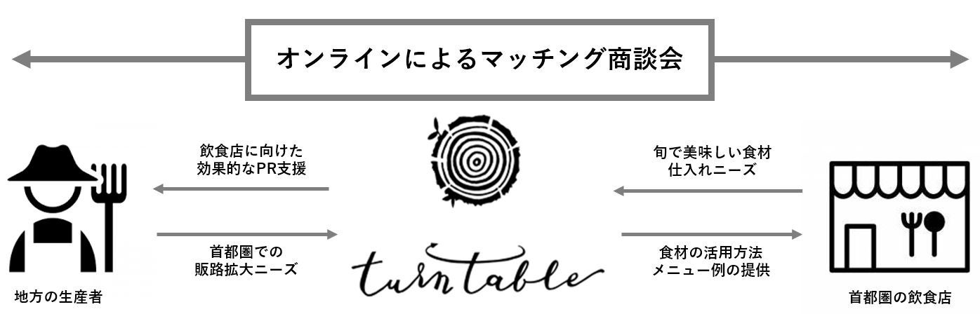 現在少しずつ収まりつつあるものの、2020年から続くコロナウイルス感染拡大による飲食店の営業自粛により、地方の生産物が売れず、都道府県をまたいだ移動制限により、積極的な地方からの営業活動もできない期間が続いていました。そこで首都圏に店舗を持つ「ターンテーブル」がハブとなり、オンラインで両者をつなぐことで、地方の生産者の販路拡大と、飲食店の仕入れニーズに合ったマッチングを実現することに成功しました。