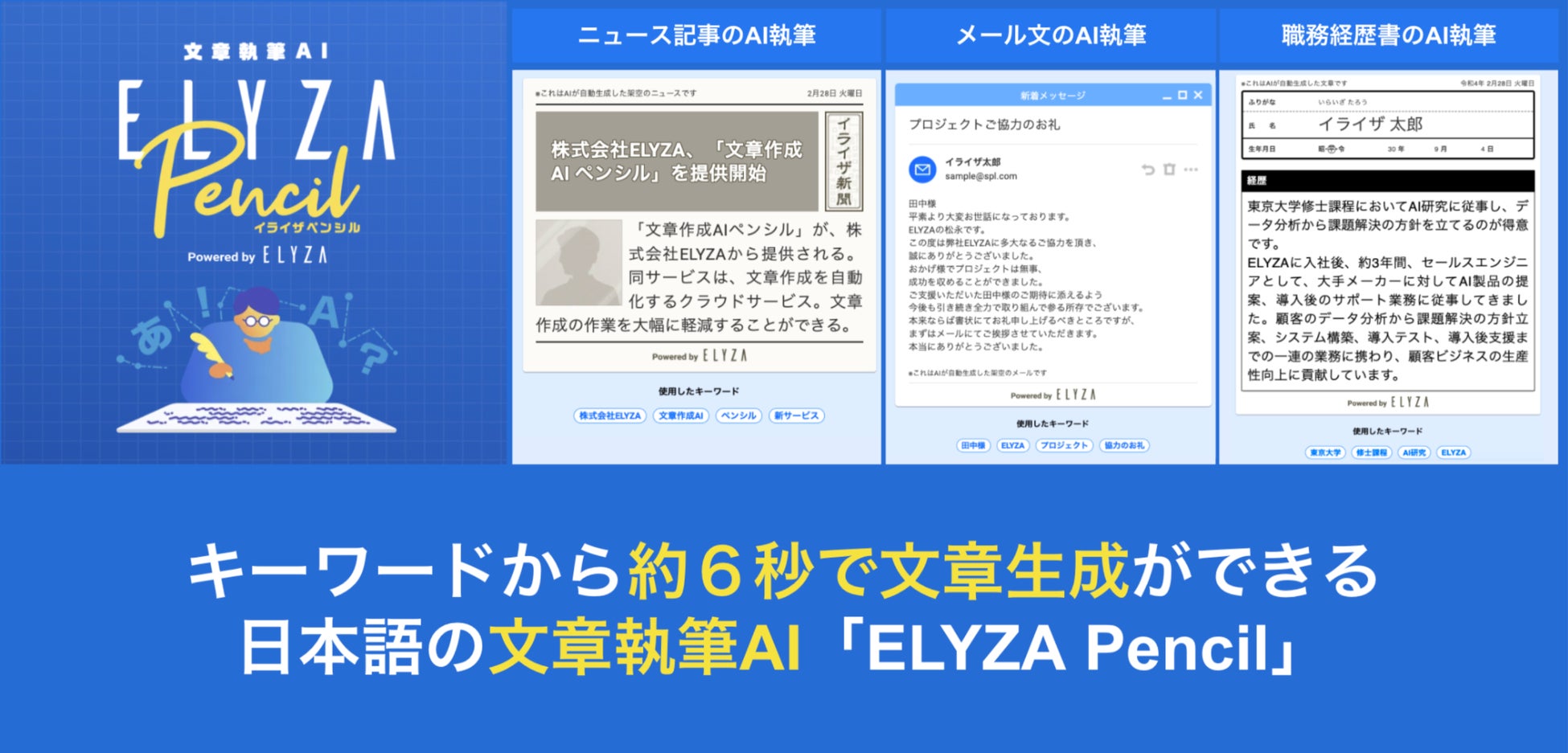 国内初。キーワードから約6秒で文章生成ができる 日本語の文章執筆AI ”ELYZA Pencil”を一般公開