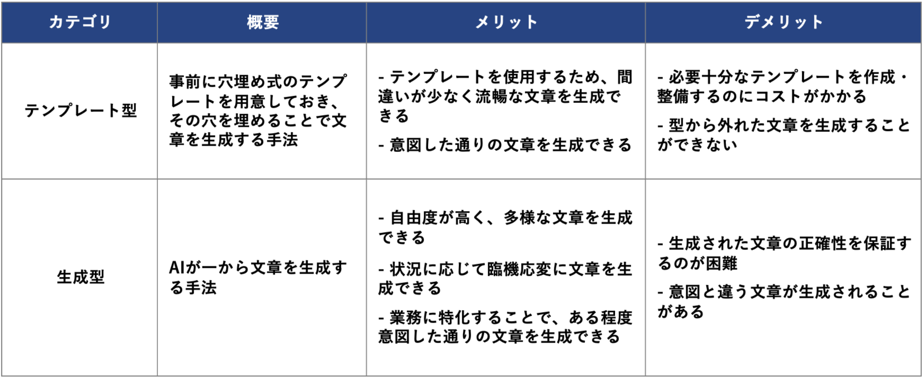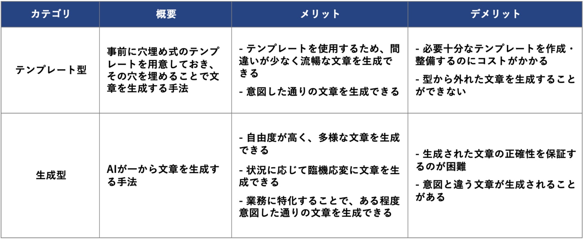 AIによる文章生成はテンプレート型、生成型の大きく2種類のモデルがあります。それぞれの特徴は下記画像をご参照ください。