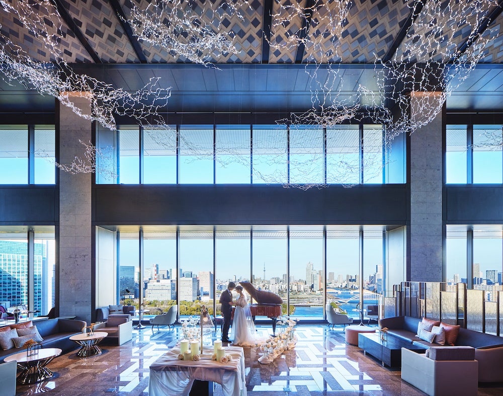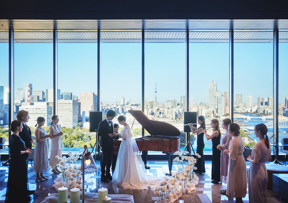 天井高9mを誇るスカイラウンジは、浜離宮恩賜庭園や隅田川、スカイツリーといった東京の過去と未来が交わる特別な場所。インテリアは、江戸・日本橋を描いた絵巻物「熈代勝覧(きだいしょうらん)」を元に人々が集まり往来する活気ある街をコンセプトにデザインされています。備え付けのグランドピアノや、希望によってさまざまな楽器を組み合わせて生まれる特別なマリアージュ(フランス語で「結婚」・調和している)をお好きな場所から見守っていただける自由な新しいスタイルの挙式です。