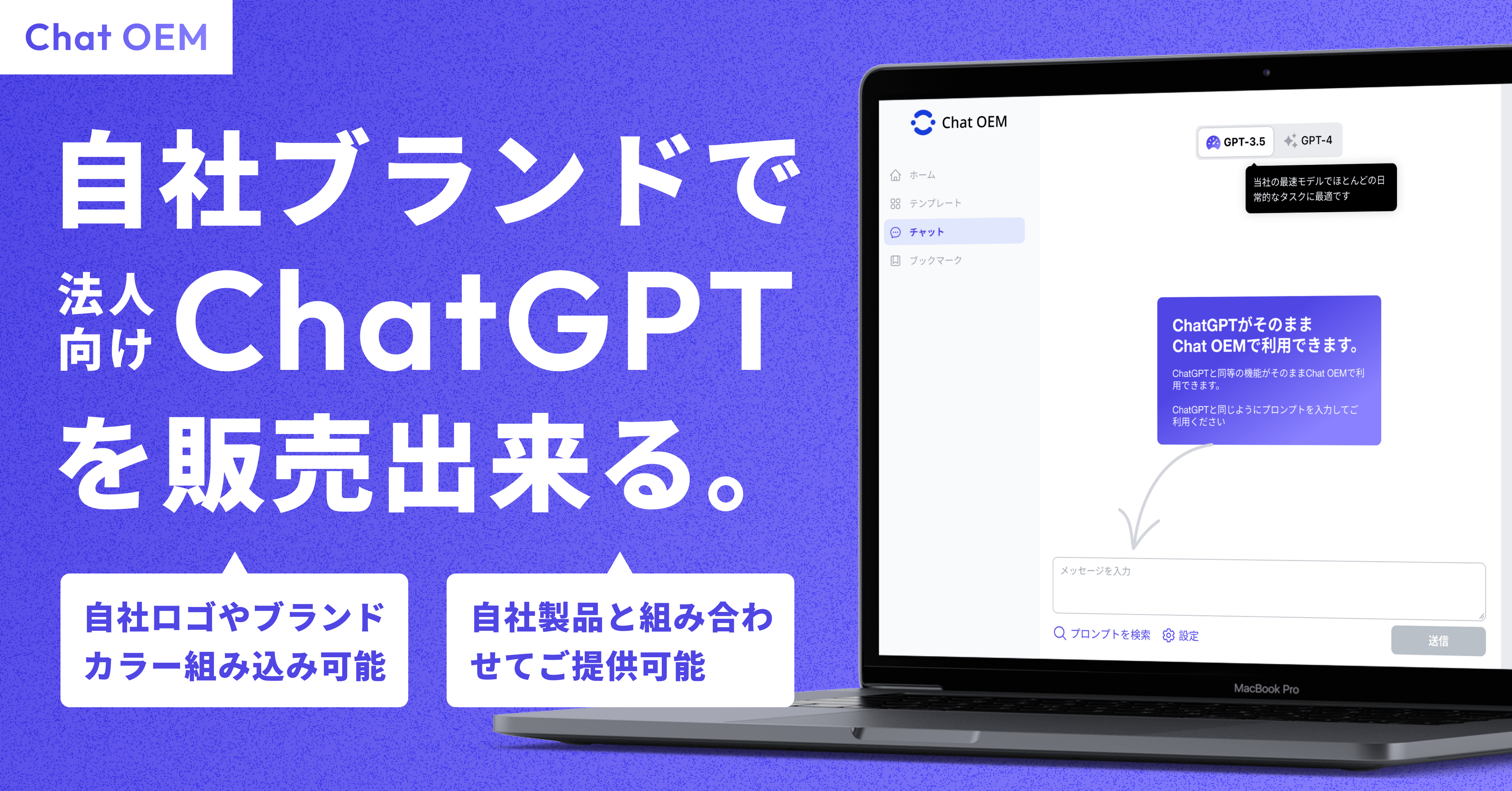 「Chat OEM」は、法人向けのニーズに特化したChatGPTのOEMサービスとして、自社ブランドを冠した「法人向けChatGPT」を販売することを支援いたします。