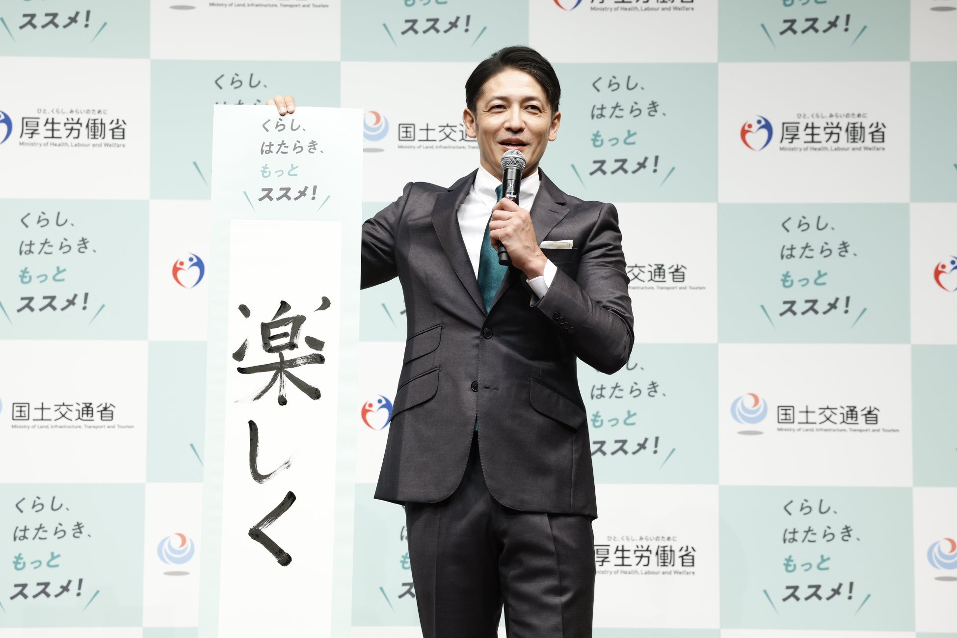 発表会の終盤には建設・運送などの業界で「現場の心得」や「スローガン」などを書いて掲げる文化にちなみ、玉木宏さんに筆を使って働き方改革への意気込みを発表していただきました。玉木さんが書き上げたのは、「楽しく」という言葉。力強く書かれたその文字について玉木さんは「シンプルではあるのですが、1人で仕事をしているわけではないので、皆で時間を共有する中で、流れている時間は同じなので、皆が各々楽しく過ごすことができれば、それが一番良い時間だなと思っています。プライベートだけではなく、仕事も楽しくするということがモットーです。」と語りました。
