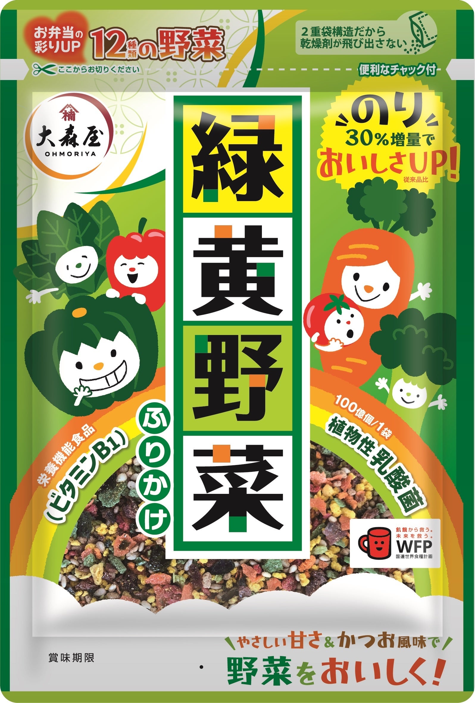野菜嫌いのお子さまにも、ごはんをおいしく食べながら健康に育ってほしいという、ふとした親心が始まりでした。今では、大森屋を代表するふりかけとなりました。12種類の緑黄色野菜が美味しく手軽に摂れます。最大の特徴は、彩りの良さ!今回、子供に人気のかぼちゃやにんじんなどの野菜具材を増量、見た目にも美味しく食べて頂ける工夫をしています。また味付きざみのり配合量を30%UP!(従来品比)
