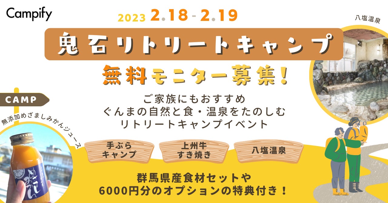 【満員御礼】【無料モニター募集】群馬県藤岡市で「鬼石リトリートキャンプ体験ツアー」参加者を募集中!