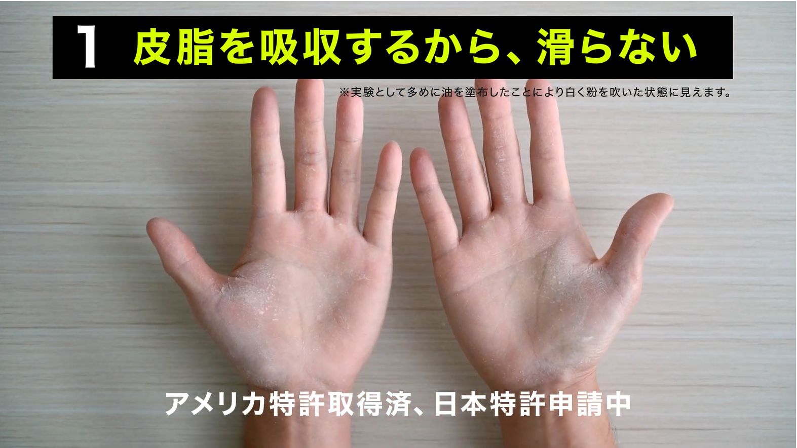 チョークレスを手の表面に擦り込むと非常に薄い「コーティング(膜)」を形成します。このコーティングが汗などの水分を弾くことで、グリップ力を持続させます。